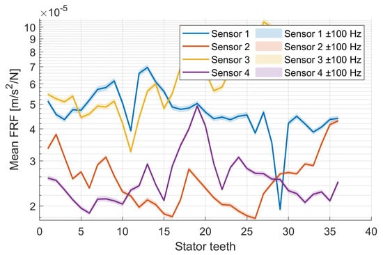The resulting frequency-averaged FRF shows that the sensor positions are excited with varying intensity by the individual stator tooth, and that each sensor exhibits a maximum response at the stator tooth closest to it (see Figure 10).