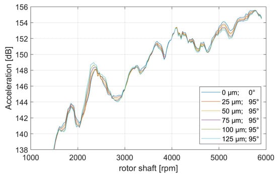 In order to study the effects of an increased eccentricity in the direction of the stator tooth 11, multiple run-up simulations with a varying eccentricity state are performed. The eccentricity angle of 95°, which is the direction of stator teeth 11, is defined with respect to a global, fixed coordinate system. The following study on varying levels of eccentricity presents results only for sensors 1 and 3, as their FRF amplitudes are significantly higher than those of sensors 2 and 4, and consequently their impact on the measured acceleration signals is expected to be greater. Although the precise tolerances contributing to the static eccentricity of the investigated machine are unknown, Ruf et al. [] determined that a similar machine exhibits static eccentricities of up to 125 µm. Therefore, increments of 25 µm were used to increase the eccentricity up to 125µm, which corresponds to approximately 18 % of the total air gap between the stator and rotor. By calculating the accelerations for a continuous run-up up to 6000 rpm, the effect of multiple eccentricity states can be visualized (see Figure 11). It can be observed that the eccentricity states in comparison to the concentric state lead to an increase or a decrease in total acceleration level at several operation conditions. At around 2400 rpm, where a bending mode at 1420 Hz is excited by the 36th excitation order (compare Figure 5), an increase in eccentricity leads to an increase in acceleration level of a maximum of 2 dB at a maximum eccentricity amplitude of 125 µm. In addition, it can be observed that for the critical operating point, the directional optimality is maintained as the eccentricity increases. However, the change in acceleration amplitude with each additional increment varies and decreases nonlinearly.