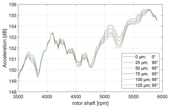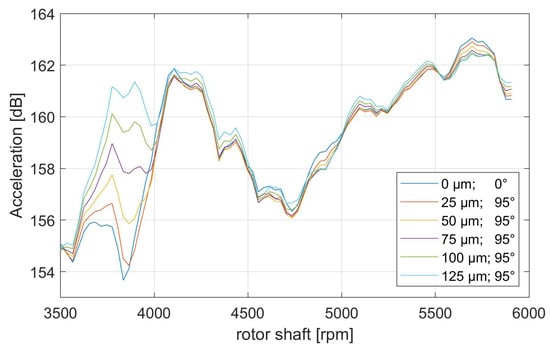 When displaying the total level of acceleration for Sensor 3 (see Figure 13), it can be observed that an increase in eccentricity amplitude might also lead to a significant increase of over 7 dB in total acceleration level, for example, at 3800 rpm. However, also this sensor signal does indicate that an increase in eccentricity is able to decrease the total level, e.g., at 5700 rpm with a decrease of 1.5 dB.