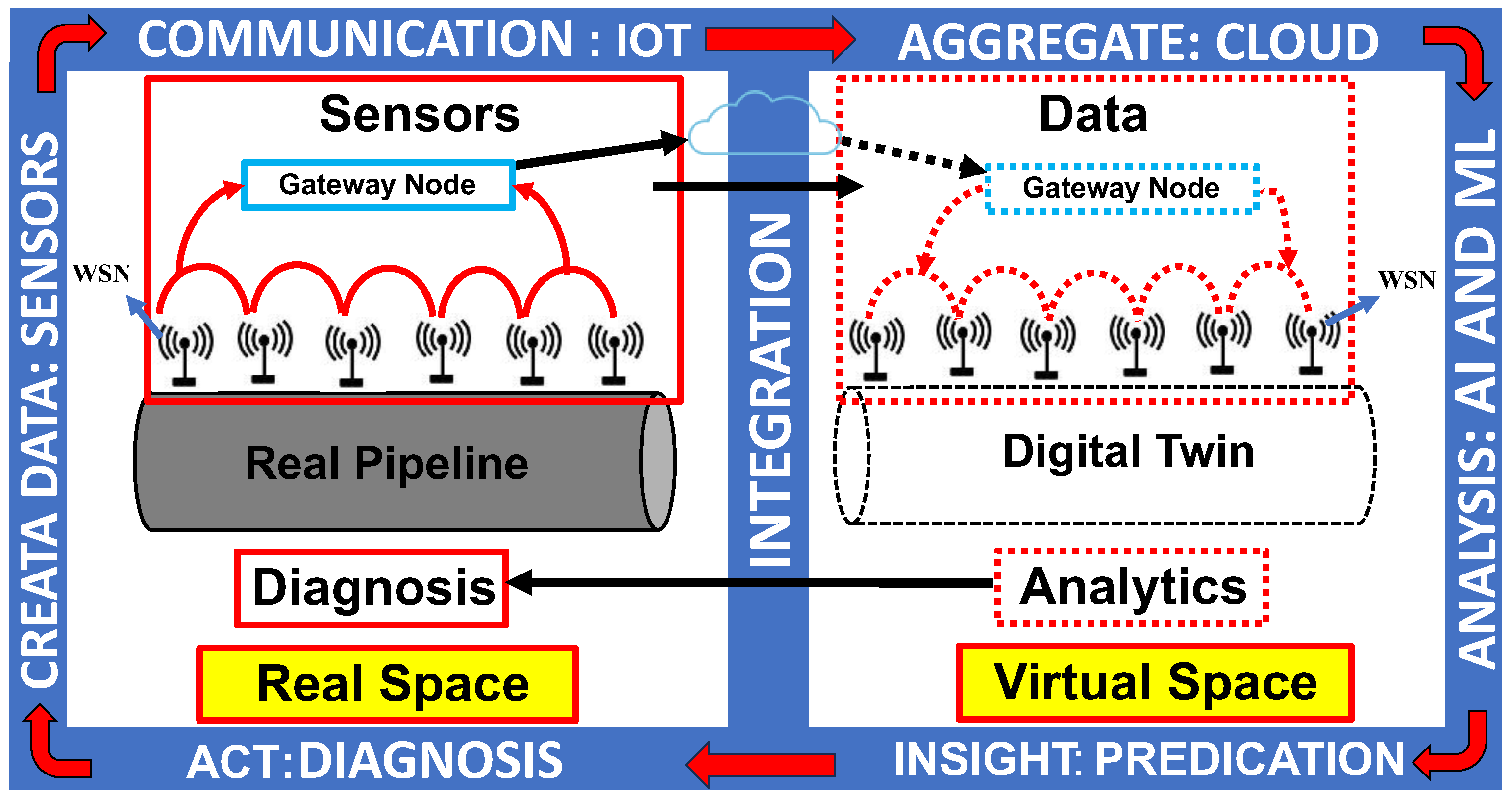 Figure 1), a network of multiple wireless sensor nodes (WSNs) is strategically placed along the length of the pipeline. These WSNs gather real-time data on various physical parameters, including pressure, flow rate, temperature, and vibration. The data are sent wirelessly to a gateway sensor node, where the information from all the WSNs is aggregated and analyzed. Using different AI algorithms, the gateway sensor analyzes the incoming data to extract valuable insights and make intelligent decisions regarding the pipeline flow. These algorithms may include machine learning techniques such as anomaly detection, pattern recognition, and predictive modeling. By continuously monitoring the data stream, the system can detect potential issues or failures in the pipeline network. It can dynamically adjust the valve positions, flow rates, and operational parameters to address emerging problems and proactively optimize system performance. In addition, the digital pipeline system is not limited to a specific area. Its global accessibility enables stakeholders, including decision-makers, maintenance personnel, and pipeline operators, to coordinate maintenance activities more efficiently and monitor the condition of pipelines remotely.