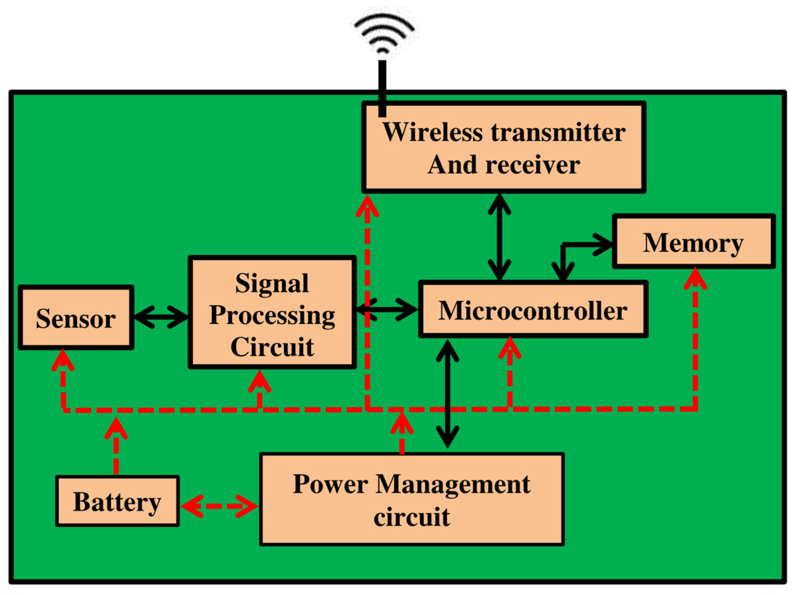 Figure 2. Wireless sensor networks (WSNs) are composed of several key elements, including sensors, memory, signal conditioning and processing units, microcontrollers, power management systems, and a transceiver unit. The sensing component detects various physical aspects of the pipeline, such as flow rate, vibration, humidity, temperature, and pressure. These sensor readings are converted into electrical signals and processed by the processing unit. The data are subsequently sent to a transceiver module for further analysis and stored in the onboard memory. A microcontroller manages all onboard operations and functions, including alert systems, sleep modes, and transmission activities. Additionally, the battery provides power to all the system components.
