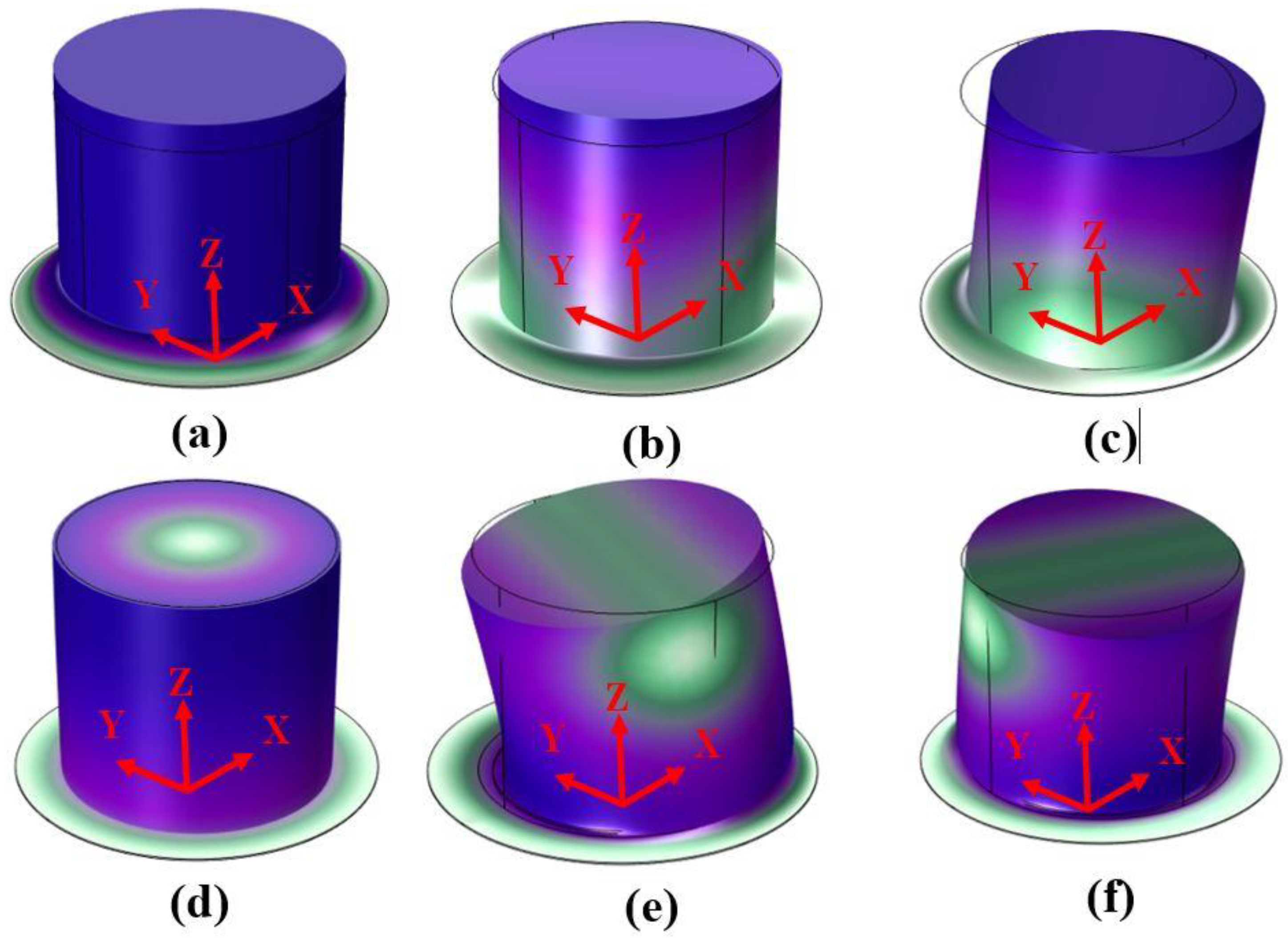 Figure 5 depicts the analysis performed in COMSOL Multiphysics 6.2 to determine the first six natural frequencies and associated vibration modes of the PE plate equipped with a magnet serving as the proof mass. At the initial eigenfrequency, the piezoelectric plate and the magnet ascend together vertically along the z-axis. The proof mass remains stationary while the plate oscillates near the periphery on the opposite side at the second eigenfrequency. At the third eigenfrequency, the piezoelectric plate oscillates vertically on opposite sides along the z-axis. At the fourth mode, the magnet rotates around the z-axis with the piezoelectric plate remaining fixed, whereas in the fifth and sixth modes, the proof mass experiences combined rotations about the z- and y-axes along with vertical motion of the piezoelectric plate along the z-axis.