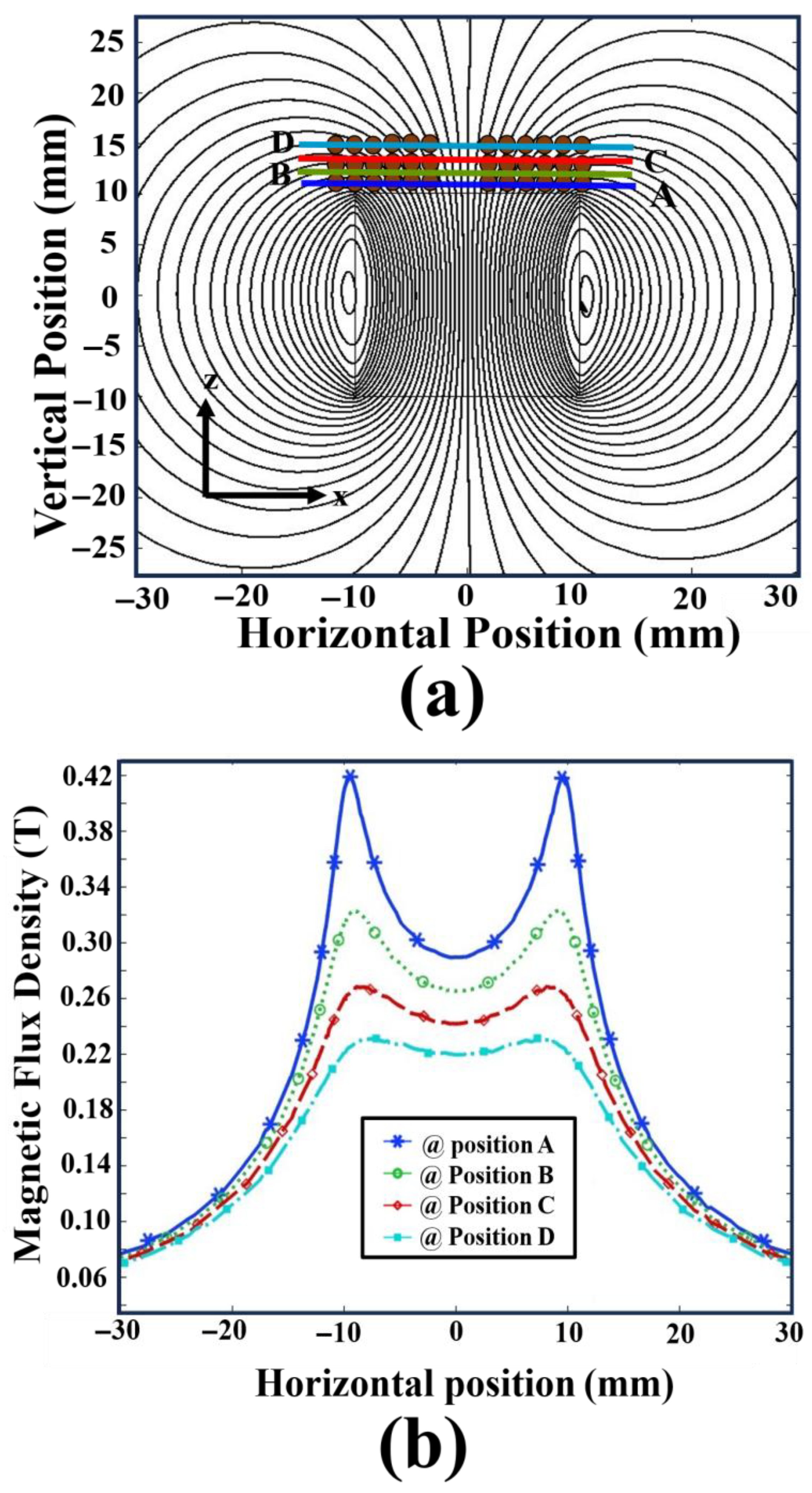 Figure 6 displays the distribution of flux density of the magnet employed in this device. A simulation was performed on a cylindrical magnet with dimensions of (10 mm in diameter, 20 mm in height) and 1.4 T remanent flux density. As depicted in