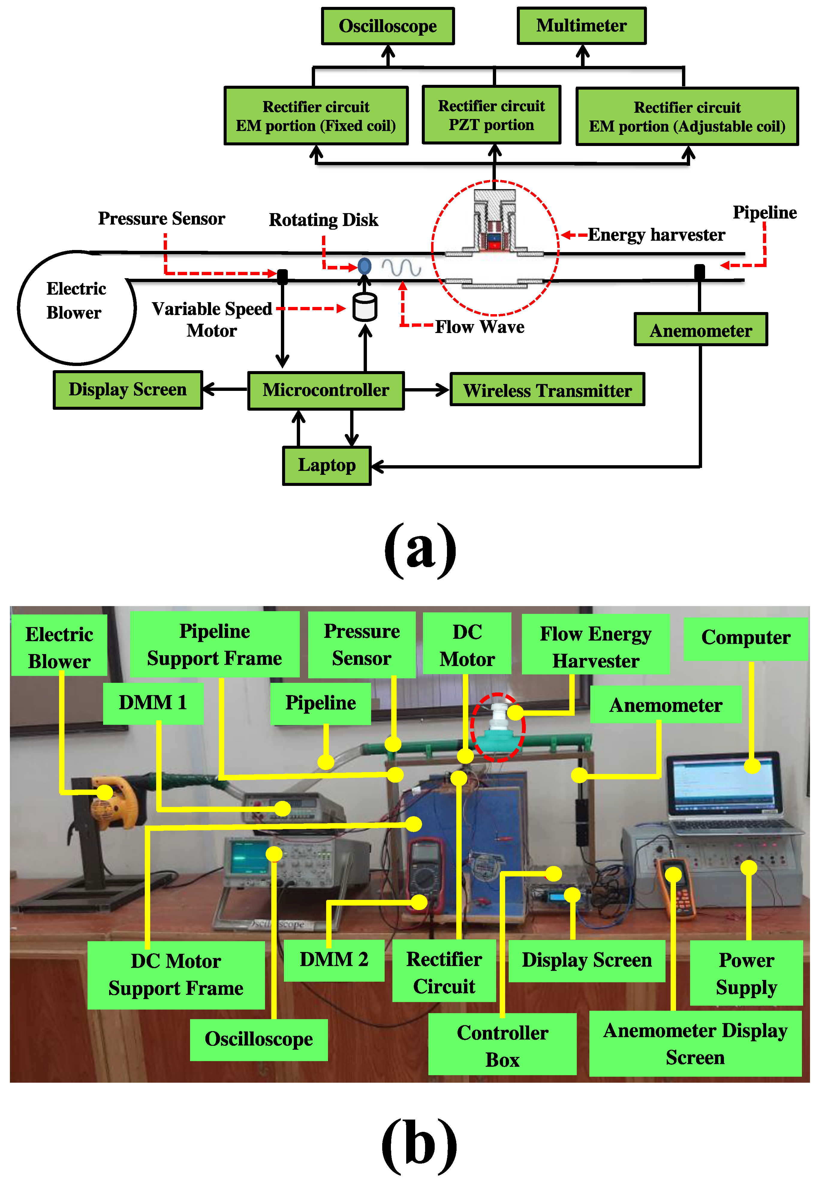 Figure 10 shows the block layout along with the actual experimental setup used for HFEH characterization. In this setup, an air blower (document number 1, BOSITENG, China) generates airflow as a substitute for gas flow. To mitigate vibrations generated by the blower during its operation, a vibration isolation rubber coupling was installed between the blower outlet and the connected PVC pipeline. The airflow was regulated by adjusting the discharge control knob of the blower. A small rotational disc is inserted into the pipeline to alter the fluid’s frequency. The disc rotation is controlled by a pulse-width modulation signal, using an Arduino Uno board and an H-bridge module. To keep track of flow pressure, a pressure sensor (MPX5010DP) is placed within the pipeline. An anemometer (GM8903) measures the flow velocity within the pipeline. Data from the pressure sensors is collected by the Arduino Uno microcontroller and displayed on a small LCD screen and a laptop. To ensure the prototype was properly aligned with the air blower, it was affixed to a PVC pipe with a diameter of 32 mm, which was positioned on a wooden pedestal. The electrical output generated by the hybrid flow energy harvester (HFEH) was interfaced with a rectifier circuit to convert the AC signal into DC form. The output voltage signals were continuously monitored and analyzed using a digital multimeter for steady-state measurements and an oscilloscope for real-time signal observation and waveform assessment.