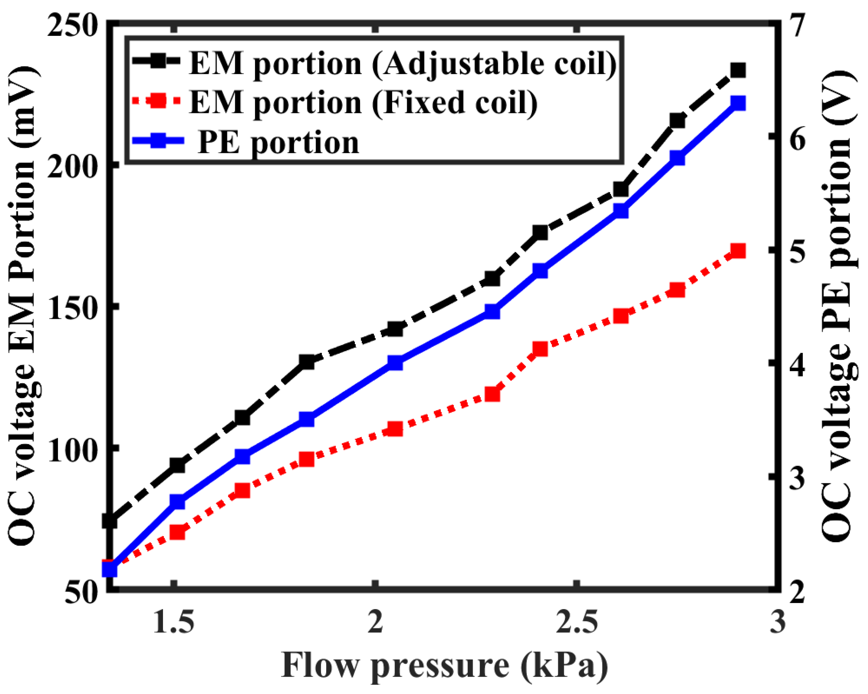 To evaluate the electrical performance of the fabricated HFEH, the RMS voltage was measured under varying flow pressures and flow rates, and the resulting relationship between open circuit (OC) RMS voltage and applied flow pressure is illustrated in
