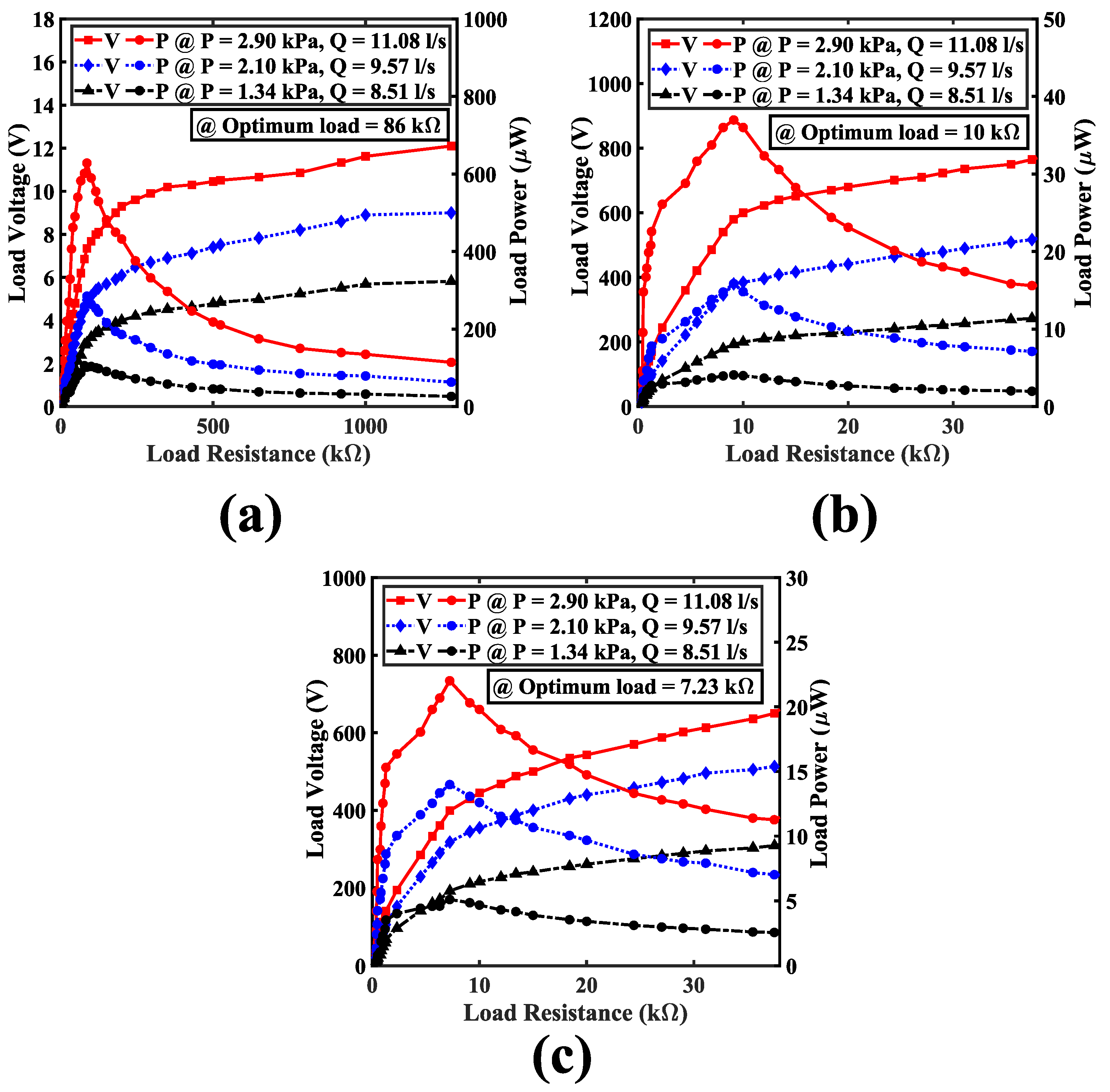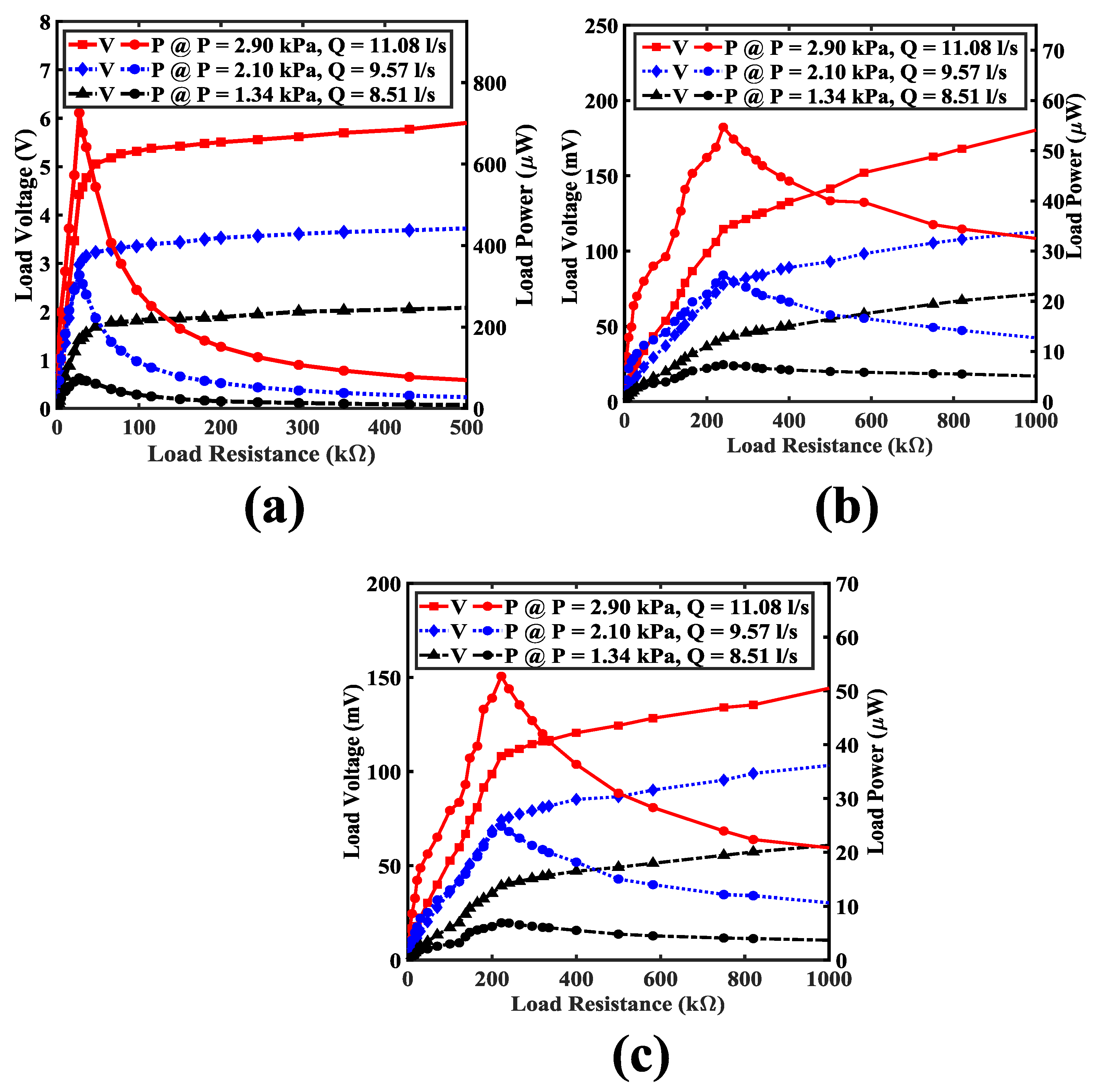 Figure 16 presents the variation in the DC output of the EH with respect to load resistance. The harvester’s performance was evaluated using flow pressures of 1.34 kPa, 2.10 kPa, and 2.9 kPa. As shown in