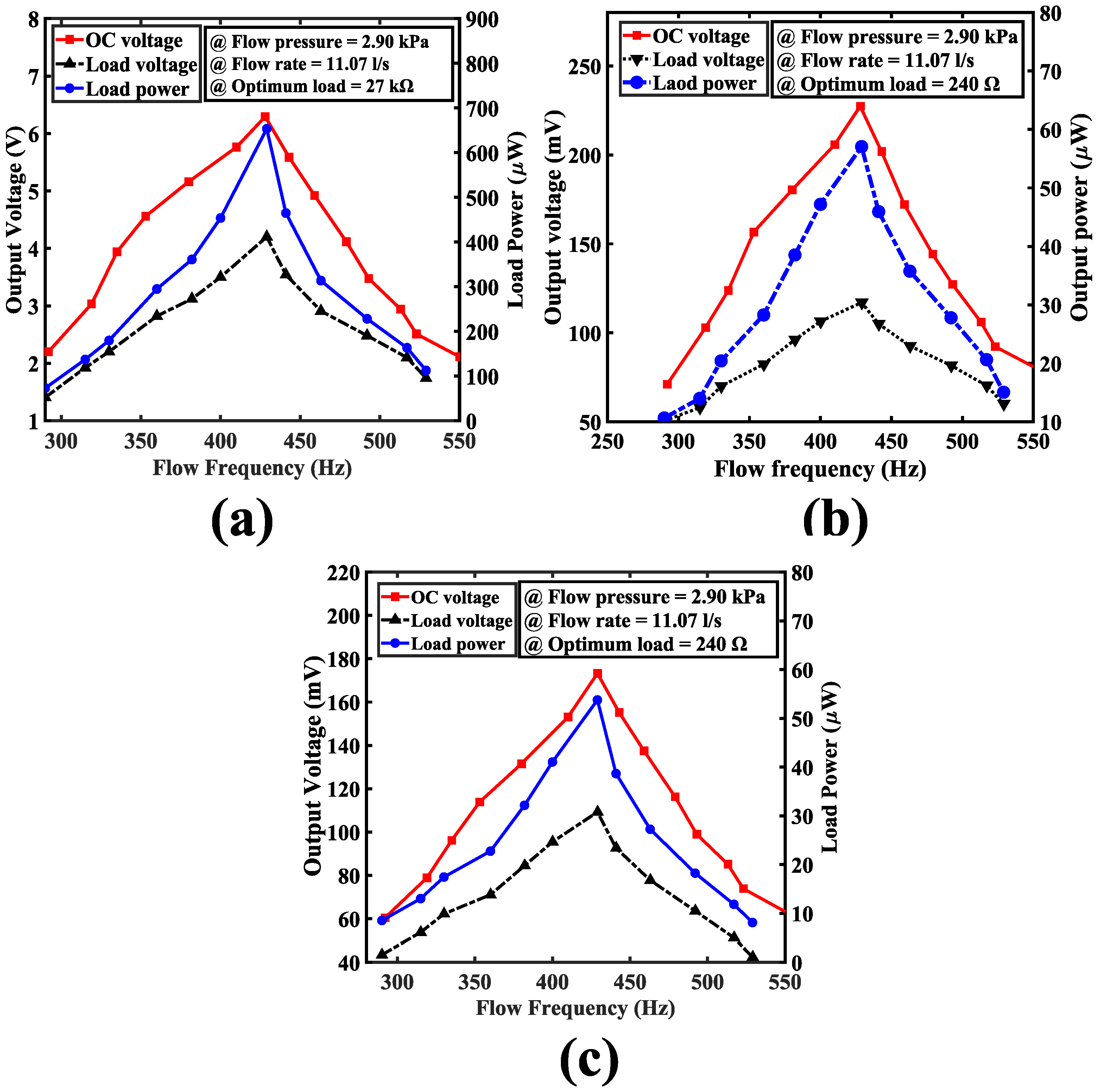 43] achieved an output voltage of 120 mV and power of 0.7 nW at a flow pressure of 0.3 kPa and frequency of 52 Hz, whereas another design [