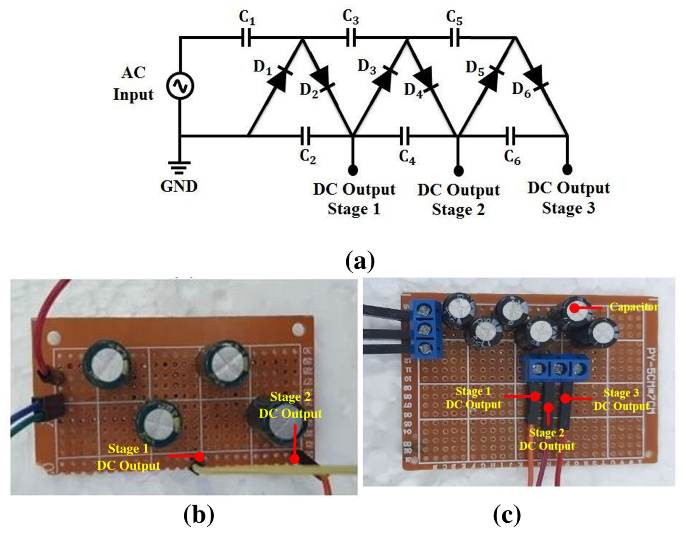 Figure 14a. These rectifying circuits, with a multi-stage design, convert the AC output of the energy harvester into DC while also increasing the voltage. A three-stage rectifying circuit was implemented to address the low output voltage from the electromagnetic section, as shown in