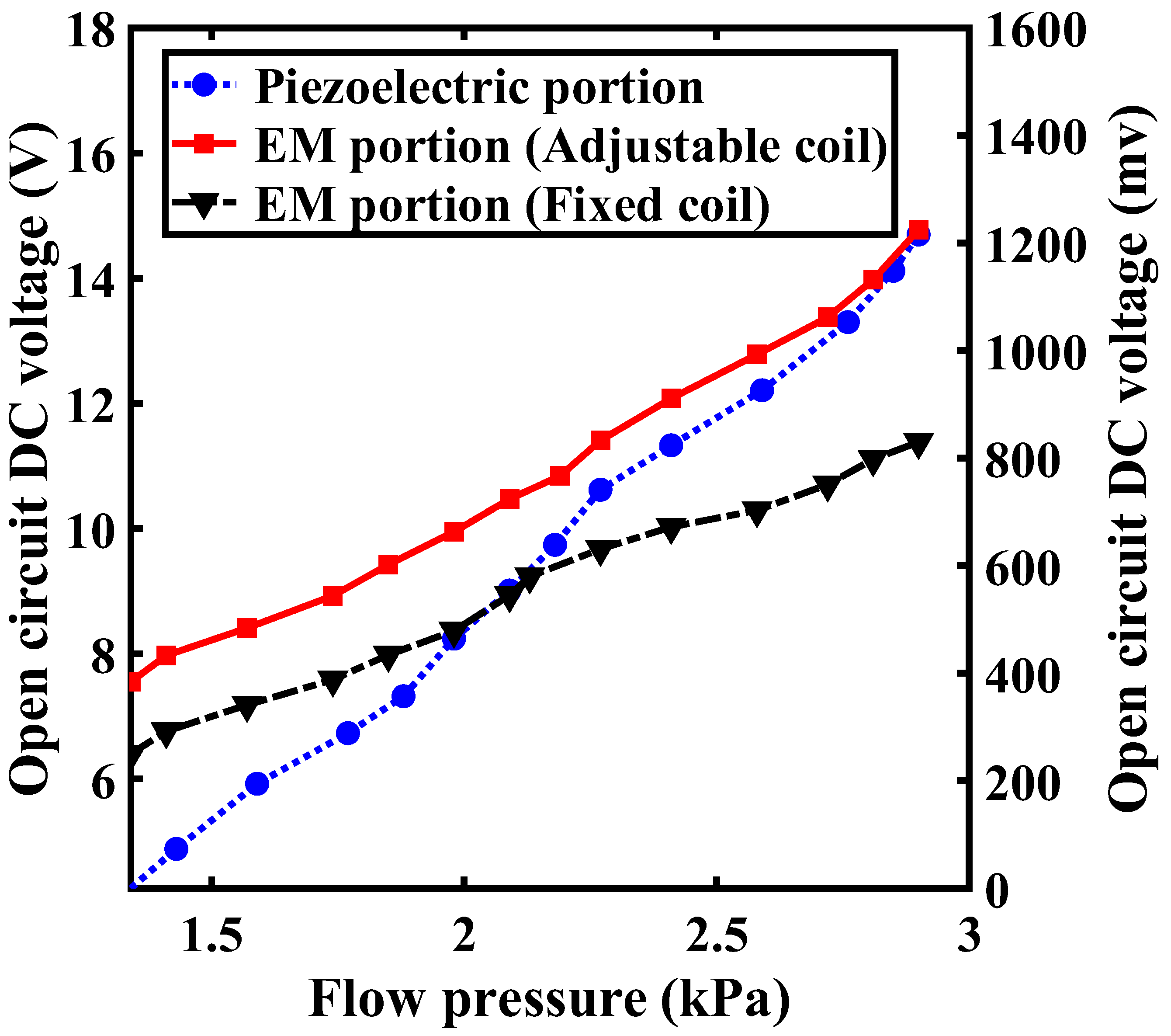 Figure 11. The experimental results indicate a clear positive correlation between the generated voltage and the magnitude of the fluid pressure, confirming that higher flow-induced excitation enhances the device’s energy conversion efficiency. At a flow pressure of 2.90 kPa and a flow rate of 11.08 L/s, the piezoelectric transducer produced an OC voltage of 6.3 V, while under identical conditions, the electromagnetic section generated 233 mV from the adjustable coil and 170 mV from the fixed coil.