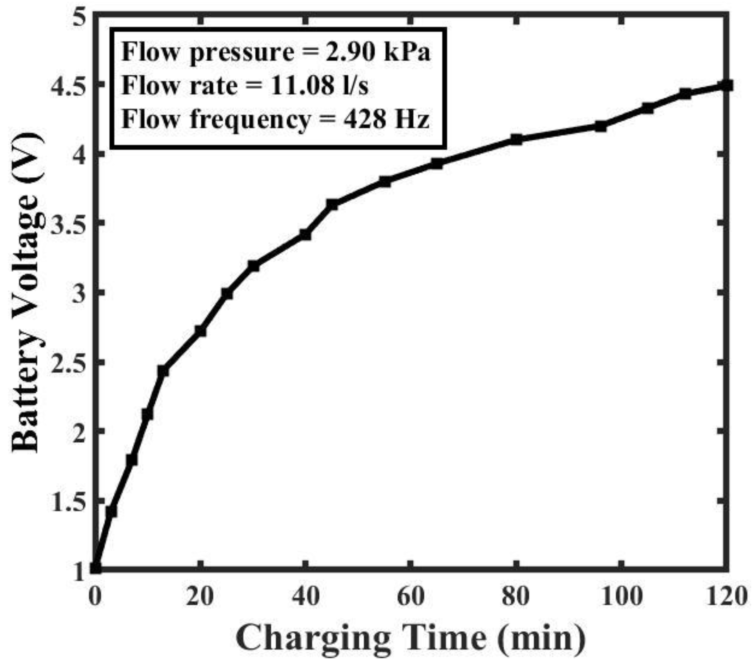 Figure 17 depicts the procedure for charging a battery using the harvester’s DC output. In this setup, a pressure of 2.90 kPa and a discharge rate of 11.08 L/s are applied. A rechargeable battery rated at 4.8 V started from a depleted voltage of 1.01 V. Then, the DC outputs from the piezoelectric and electromagnetic components were connected in series, and this combined DC output was linked to the battery. The voltage across the battery’s terminals increased over time as the battery gained energy and was periodically monitored. The battery voltage increased to 2.12 V in the first ten minutes and 3.42 V in the following thirty minutes. Furthermore, over a duration of 120 min, the battery voltage reached 4.49 V.