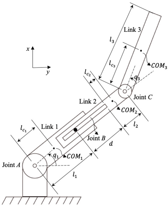 42]. As dynamic modeling is not the primary focus of this study, the resulting equations are provided directly rather than re-deriving them in full. The Euler–Lagrange equations of motion for the designed three-link planar RPR robotic arm mechanism are given in the following.