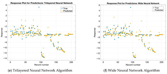 Figure 3a–c,e,f—corresponding to the bilayered, medium, narrow, trilayered and wide neural network models, respectively—do not display significant differences from one another. The models show a common pattern, where their most accurate predictions of actual values happen after reaching record number 120. Before this point, the models other than the optimizable neural network tended to show reduced prediction accuracy, indicating that the other models struggled to align their predicted values with actual observations in the earlier portion of the dataset.