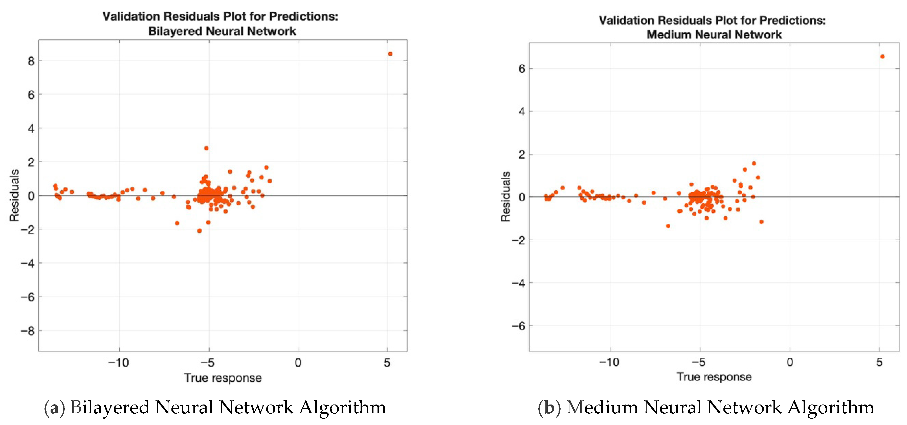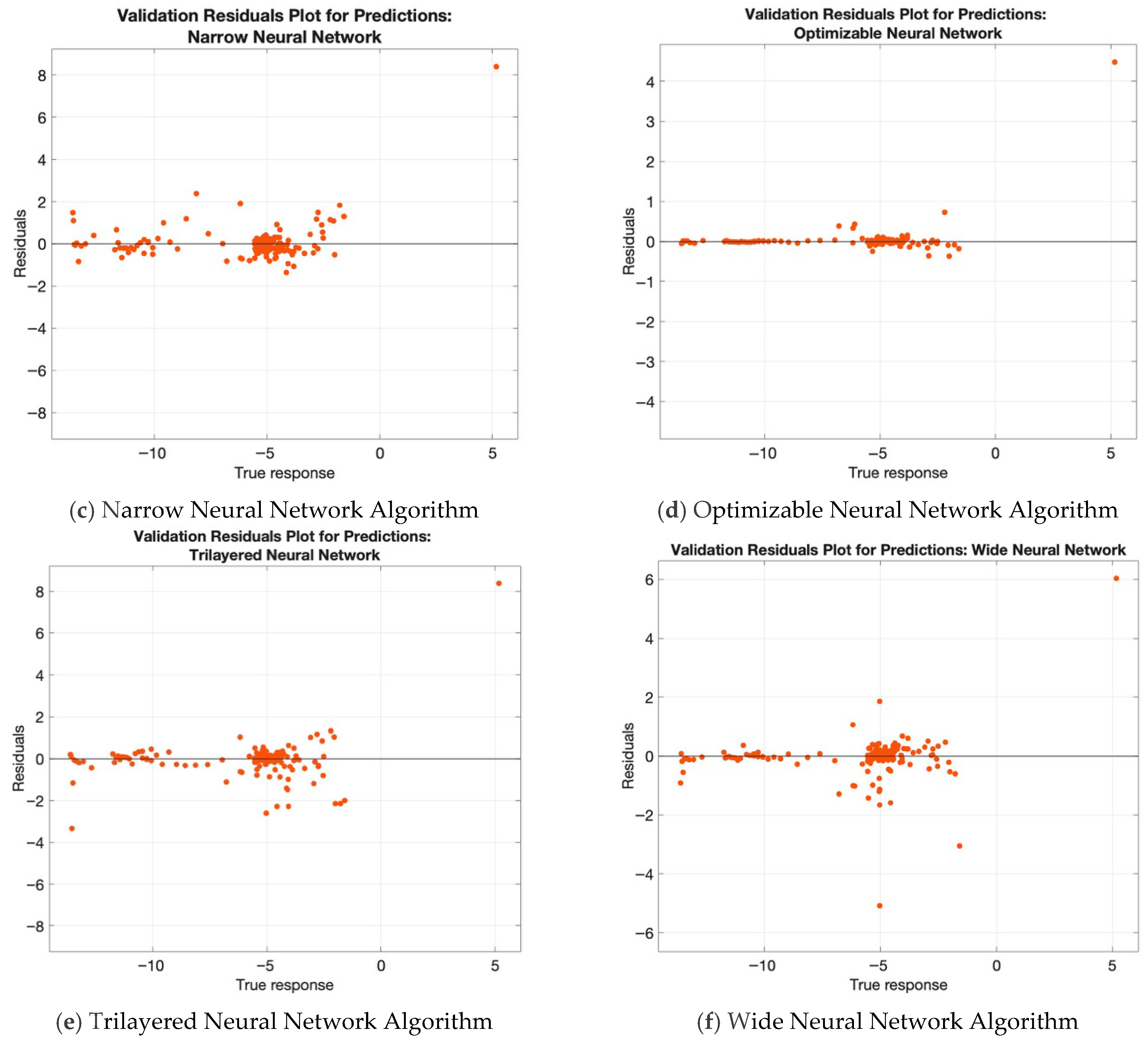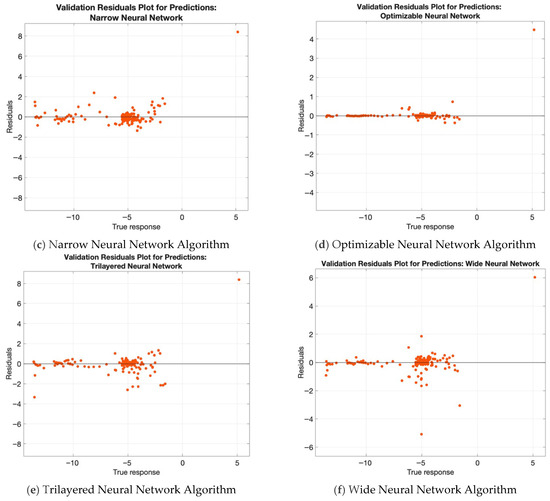 Figure 4 presents the residual plots for the predictions generated using each neural network algorithm investigated in this study. The residual plots display the degree of matching between the model predictions and the actual data points. The optimizable neural network showed the most accurate results, as can be seen from