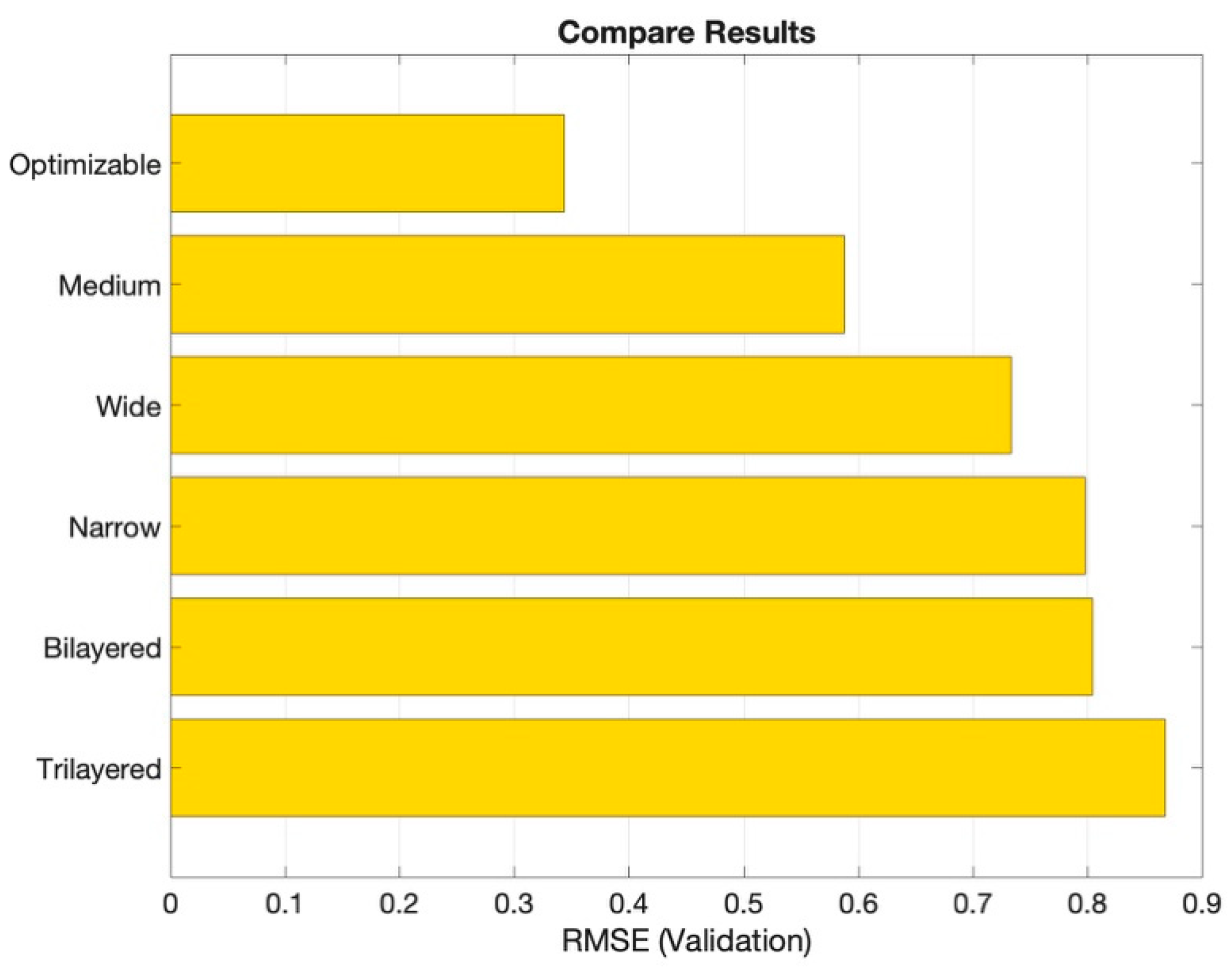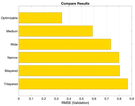 Figure 6 presents a comparison of the Root Mean Squared Error (RMSE) values for each artificial neural network regression model investigated in this study, from which it can be seen that the optimizable neural network regression model exhibited the lowest RMSE value, while the trilayered neural network model obtained the highest value. Specifically, the RMSE (validation) values were 0.8679, 0.8045, 0.7979, 0.7333, 0.5879 and 0.3438 for the trilayered, bilayered, narrow, wide, medium and optimizable neural network models, respectively.