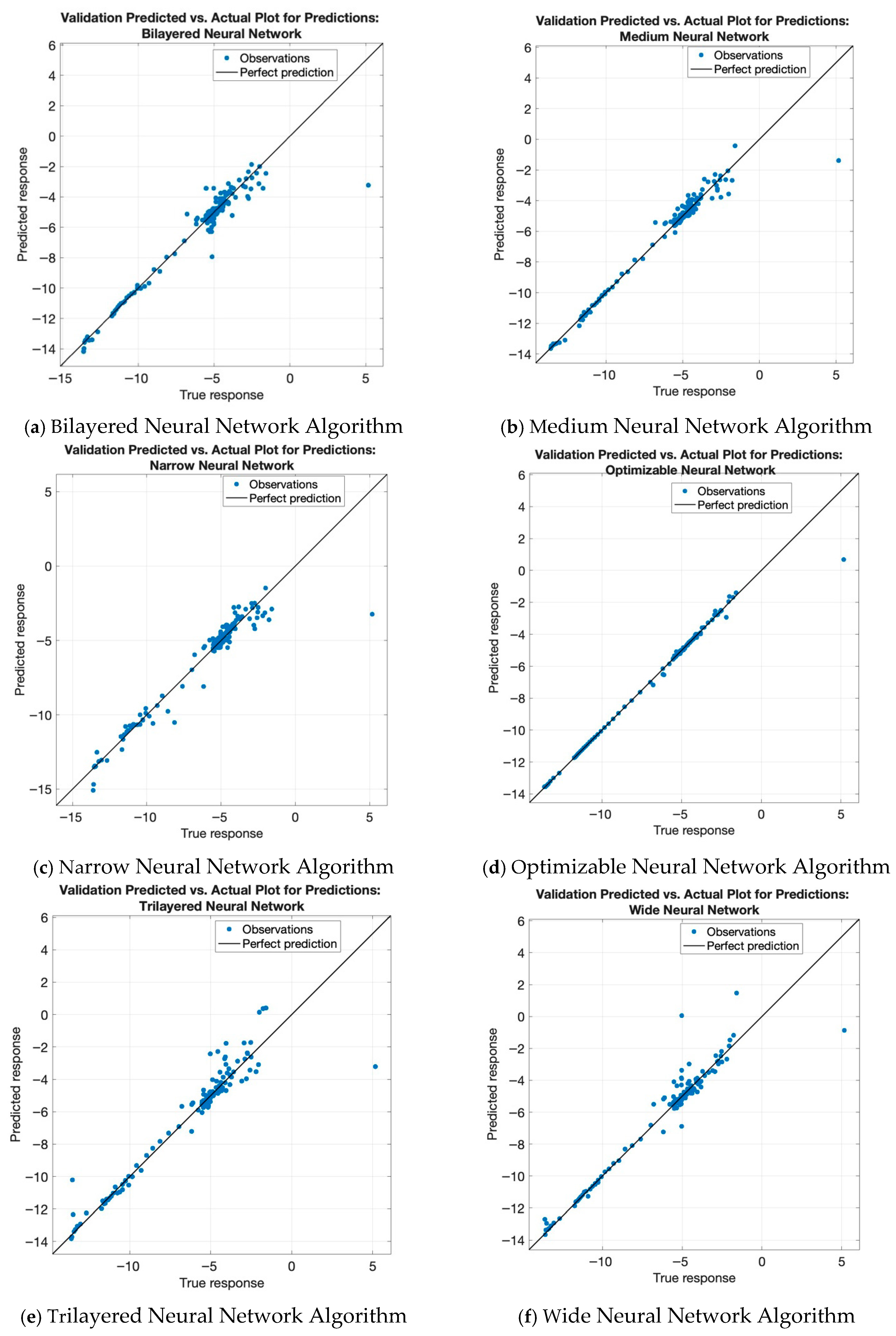 Figure 2 illustrates the predicted versus actual values for all neural network regression models investigated in this study. As shown in