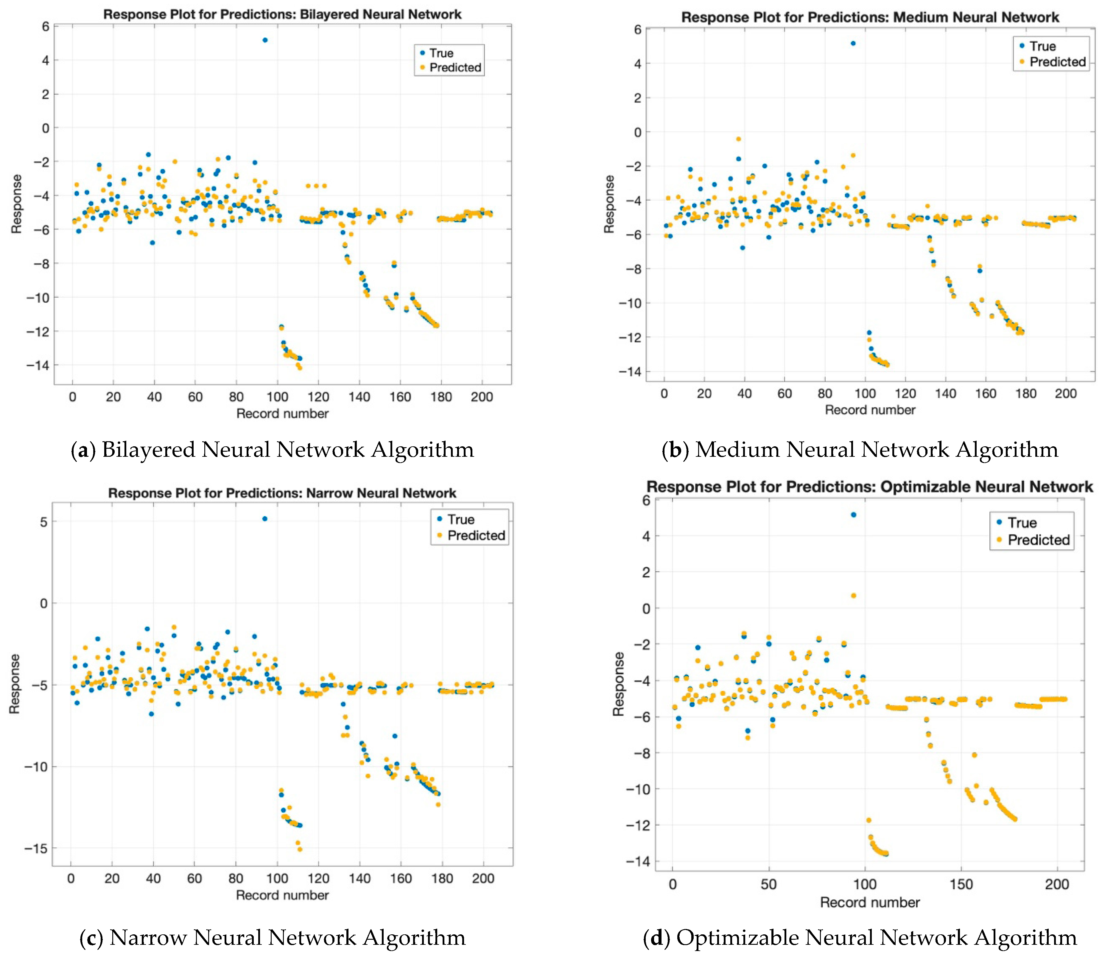 Figure 3d, the optimizable neural network model exhibited the best performance, with most of the predicted values closely matching the true values. In other words, this model produced the most accurate response plot among all those examined. In contrast,