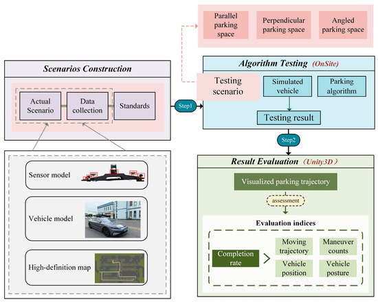 A framework was developed to test and evaluate AVP technologies during the third OnSite autonomous driving algorithm testing in 2025. As shown in Figure 1, the testing and evaluation workflow consists of three modules: scenario construction, algorithm testing and result evaluation. The scenario construction module employs sensors and vehicles to collect data to construct a library of testing scenarios, complying with industry standards. The testing module generates virtual simulation environments that interact with vehicle models and automatic parking algorithms using OnSite platform in a Python 3.8 programming environment. After testing is completed, the evaluation module collects data related to vehicle status and posture and inputs the data into Unity3D platform for visualization and evaluation of the performance of parking algorithms. The performance is evaluated primarily based on completion rate, and secondarily on four key performance indicators, including trajectory, maneuver counts, vehicle position, and vehicle posture.