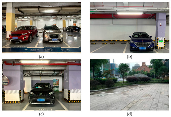 Illustration of four field parking scenarios: (a) vertical parking space with square column on left side; (b) vertical parking space with square column on right side; (c) vertical parking space with square columns on both sides; (d) parallel parking space on curved road.