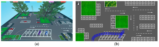 As shown in Figure 6a, the 3D simulation scenario is produced on Unity3D platform. The platform is used to reconstruct the geometric, kinematic and perceptual characteristics of the physical testbed and to provide a deterministic, real-time environment for HiL validation. The parking geometry, lane markings and surrounding obstacles are modeled to metric scale and mapped to a common Cartesian reference frame. Virtual encoders, inertial measurement unit and range sensors are implemented to reproduce the interfaces and noise characteristics of the physical hardware. The movable camera on the Unity3D platform allows for real-time observation of vehicle operation. Simulation execution (start, pause) and speed scaling are all achieved through graphical user interface buttons.
