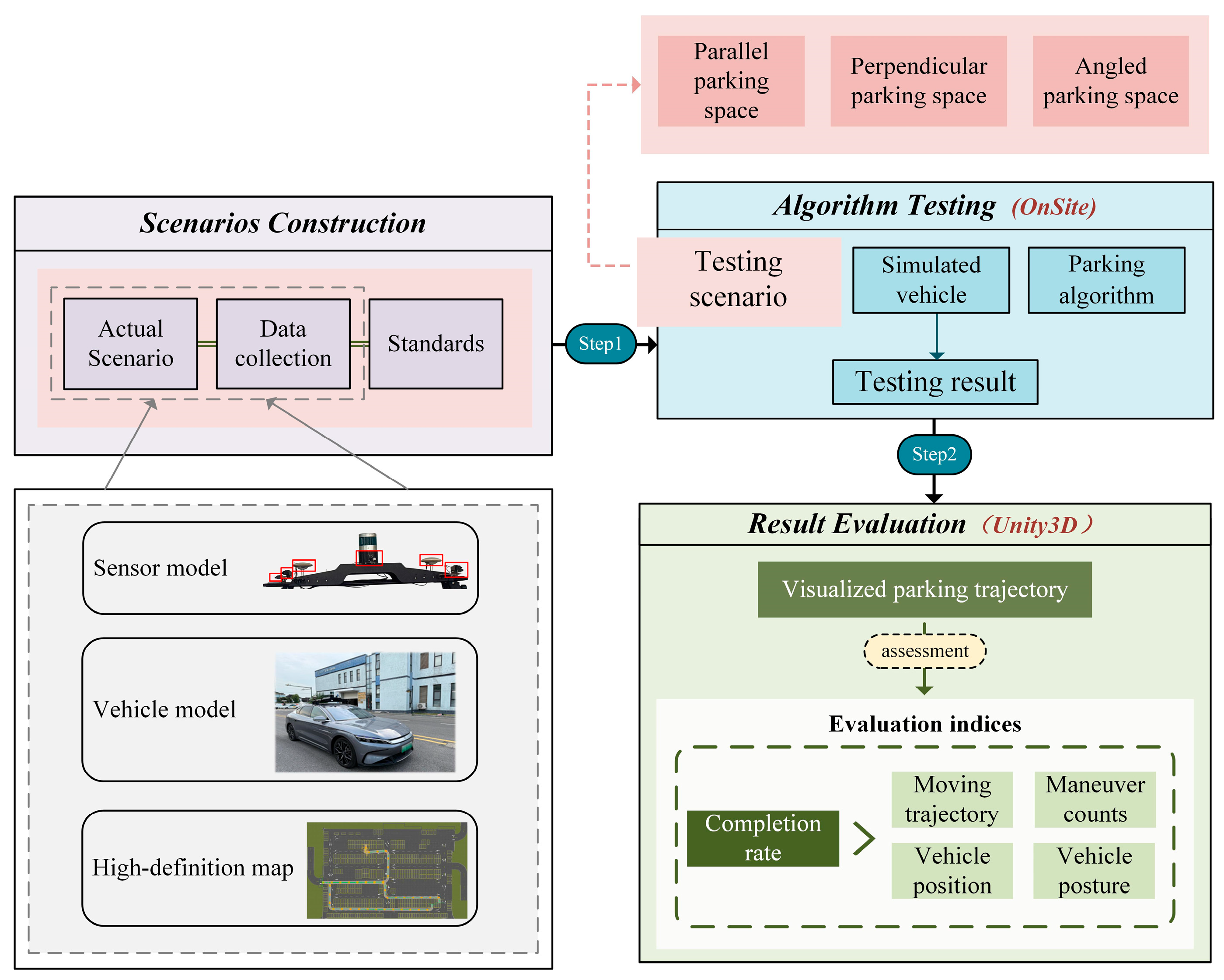 Figure 1, the testing and evaluation workflow consists of three modules: scenario construction, algorithm testing and result evaluation. The scenario construction module employs sensors and vehicles to collect data to construct a library of testing scenarios, complying with industry standards. The testing module generates virtual simulation environments that interact with vehicle models and automatic parking algorithms using OnSite platform in a Python 3.8 programming environment. After testing is completed, the evaluation module collects data related to vehicle status and posture and inputs the data into Unity3D platform for visualization and evaluation of the performance of parking algorithms. The performance is evaluated primarily based on completion rate, and secondarily on four key performance indicators, including trajectory, maneuver counts, vehicle position, and vehicle posture.