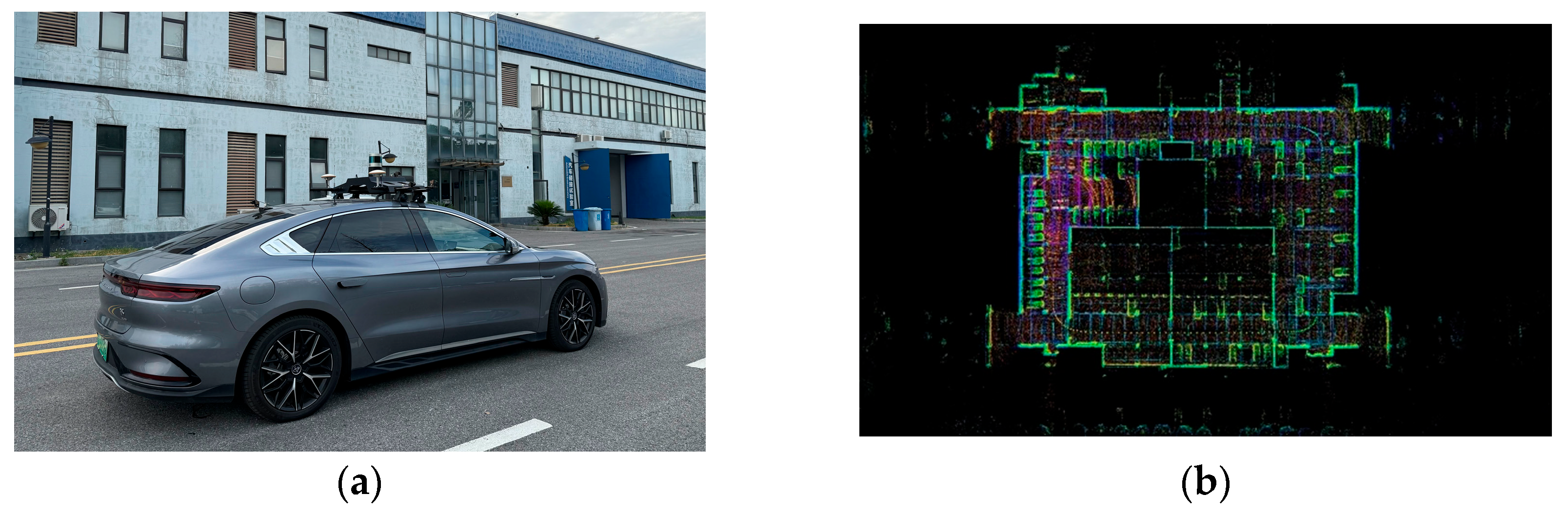 Figure 2, a self-developed data collection platform is developed with vehicle-equipped LiDAR and other sensors to collect high-definition point cloud data in parking spaces. The vehicle is equipped with a LiDAR, six cameras, an image acquisition card, an industrial computer, a drive-by-wire system, a display, and some other in-vehicle devices. Through filtering, denoising, segmentation, and data annotation, key features such as parking space boundaries, parking lines, and columns are extracted. Point cloud registration and geometric reconstruction algorithms are then applied to accurately rebuild the physical environment, achieving a one-to-one simulation restoration of parking scenes.
