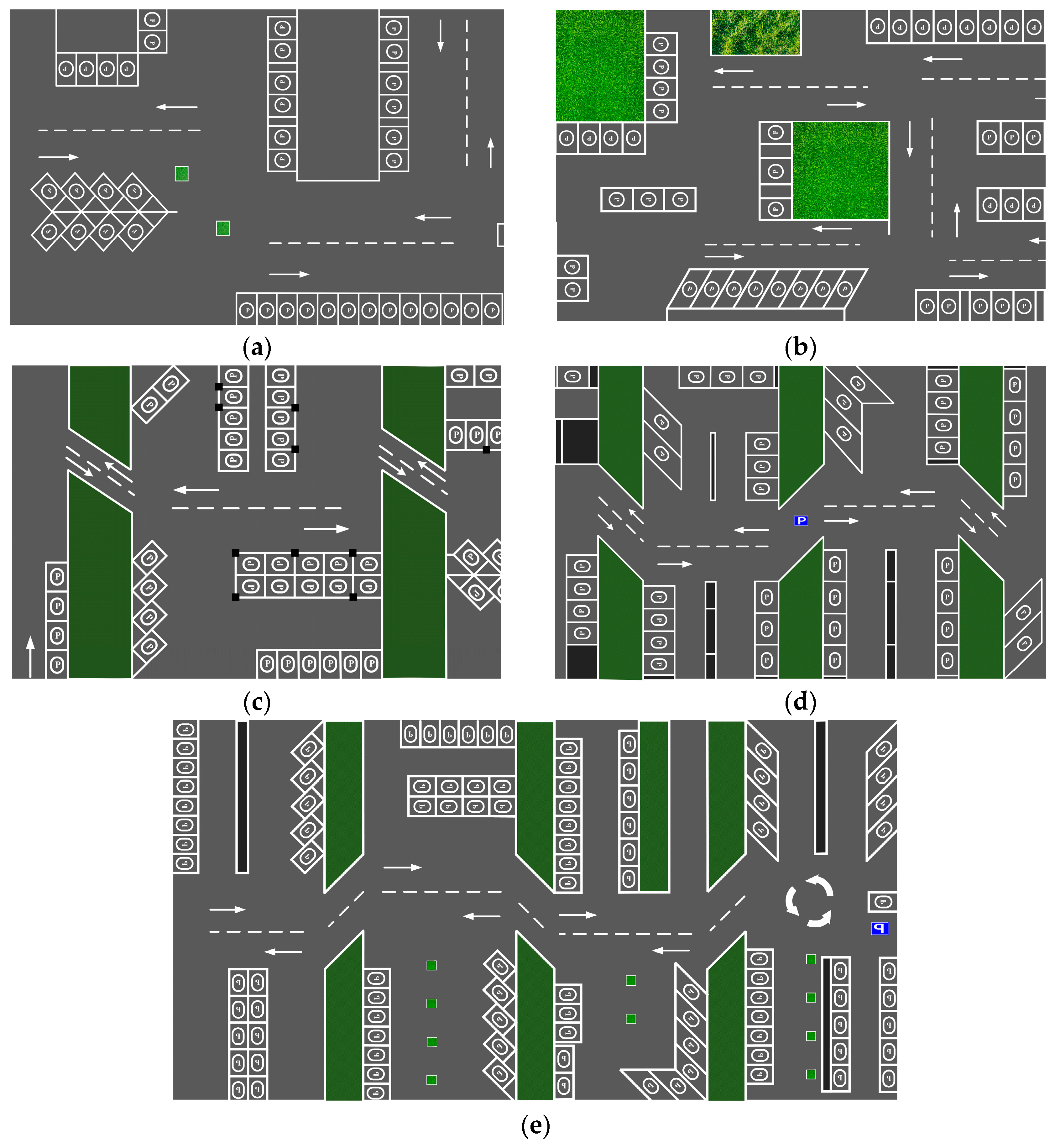 Figure 4. The four scenarios are vertical parking spaces with a square column on the left side, vertical parking spaces with a square column on the right side, vertical parking spaces with a square column on both sides, and parallel parking spaces along a curved roadway.