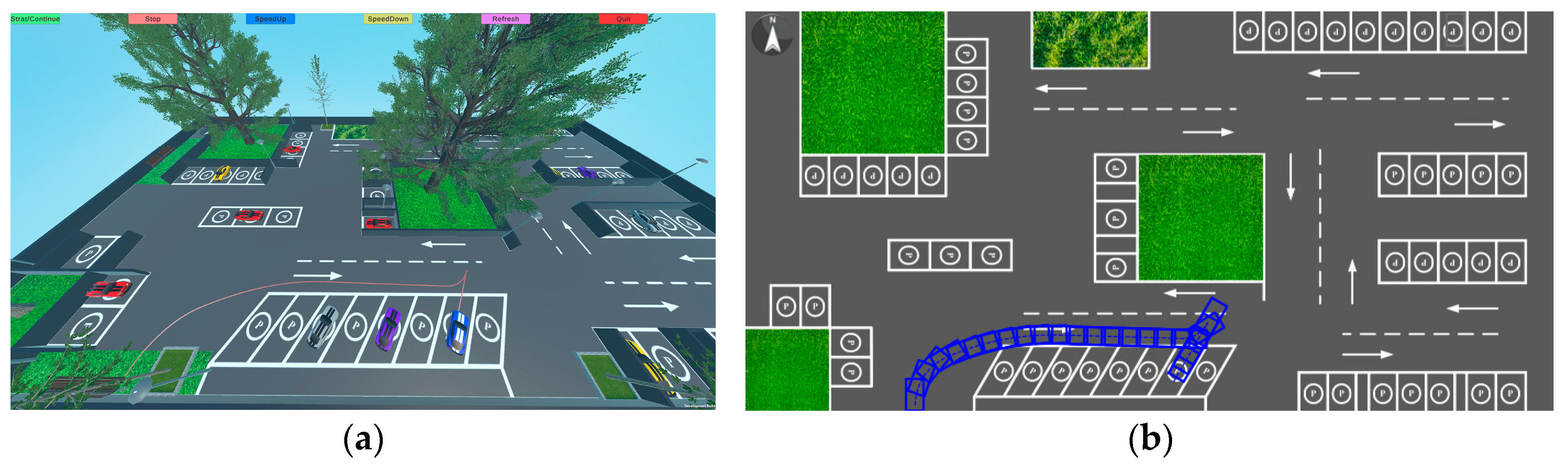 Figure 6a, the 3D simulation scenario is produced on Unity3D platform. The platform is used to reconstruct the geometric, kinematic and perceptual characteristics of the physical testbed and to provide a deterministic, real-time environment for HiL validation. The parking geometry, lane markings and surrounding obstacles are modeled to metric scale and mapped to a common Cartesian reference frame. Virtual encoders, inertial measurement unit and range sensors are implemented to reproduce the interfaces and noise characteristics of the physical hardware. The movable camera on the Unity3D platform allows for real-time observation of vehicle operation. Simulation execution (start, pause) and speed scaling are all achieved through graphical user interface buttons.