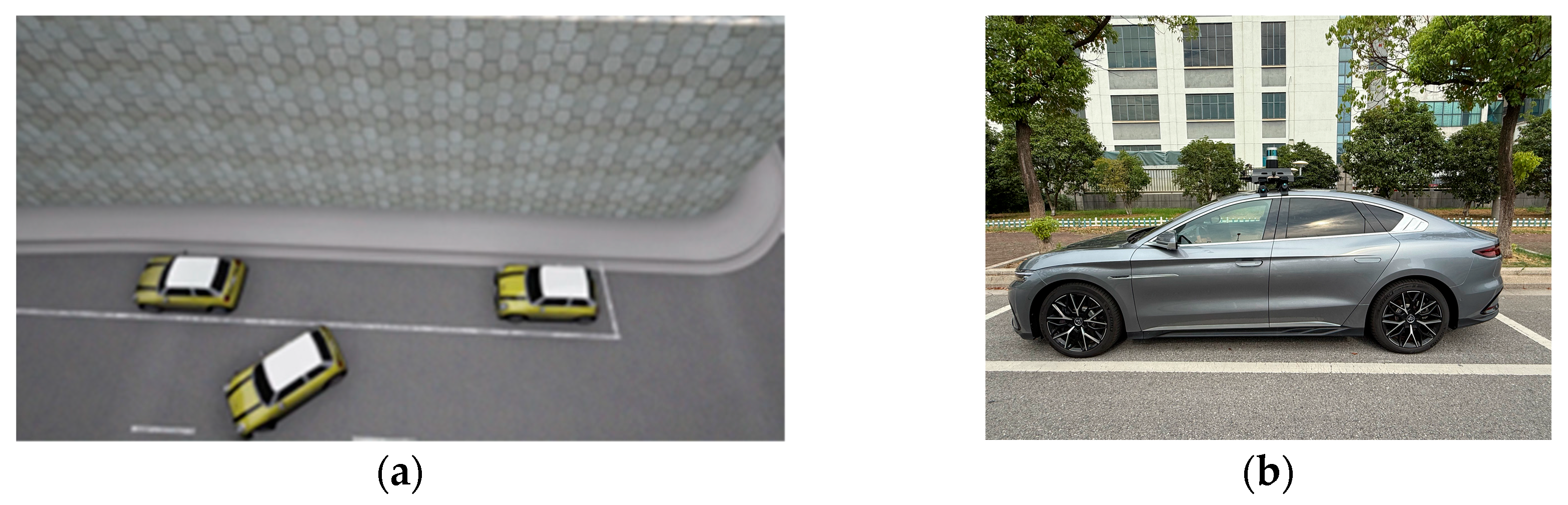 Real-world data of a ground-level parking lot in Suzhou, China, were collected to create a simulation environment and verify algorithm consistency. An X86 system environment and a modified BYD Han DM with LiDAR and camera sensors were used in the real-vehicle test platform. The autonomous driving vehicle and the CARLA simulation platform are displayed in