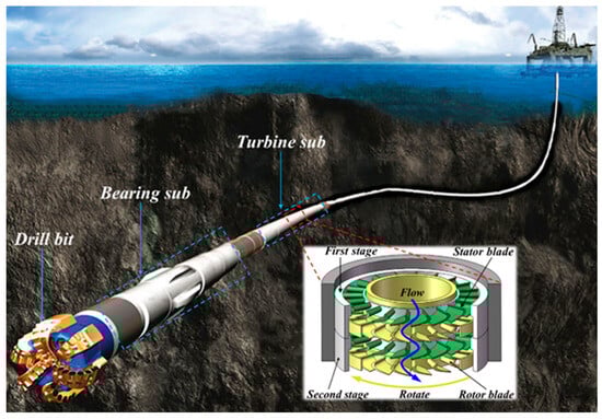 The turbodrill is mainly composed of a turbine motor, bearing section and drill bit [24], as shown in Figure 1. The whole turbodrill is a full metal structure, so it has a strong ability to withstand high temperature and high pressure. It is the first drive drilling tool applied in extreme environments. The turbine motor is an axial turbomachinery that is superimposed by a multi-stage stator and rotor to achieve the desired torque and hydraulic efficiency. Its function is to convert the hydraulic energy provided by the drilling fluid pumped from the ground to the downhole into mechanical energy through the diversion of the stator and rotor blades to achieve rotary rock breaking [25]. The bearing section contains a thrust bearing and a radial centralizing bearing. Its function is to provide rotating support, carry load, reduce friction, and maintain alignment, thereby improving the drilling efficiency and stability of the drilling tool.