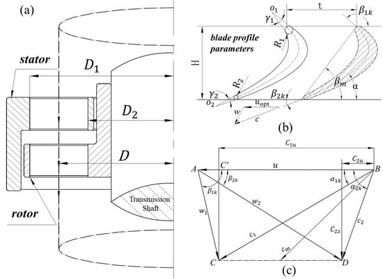 Analysis diagram of central flow channel and velocity triangle of turbodrill: (a) Flow channel diagram of drilling tool; (b) Blade profile parameter diagram; (c) Velocity triangle diagram.