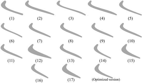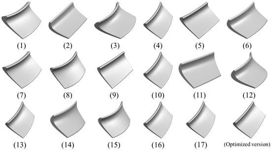 The influence of the three-dimensional blades of the turbodrill on its hydraulic performance can be quantified by three key parameters. The specific value range is: . , . The same method was used to generate experimental data using the Box–Behnken Design (BBD) method. In combination with ANSYS Fluent, the numerical simulation is carried out to obtain the numerical solution. These simulation results will be used as input samples of intelligent optimization algorithms to support subsequent analysis. Table 2 shows the experimental design and results of three-dimensional blade forming parameters BBD. Figure 7 shows the blade profile corresponding to the BBD test design data of the three-dimensional blade forming parameters in Table 2.