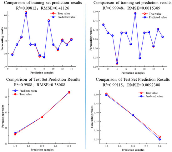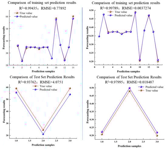 After importing the data set in Table 1 into Matlab, the training set was first set to account for 80% of the total data set and configure the relevant algorithm parameter range. Subsequently, the genetic algorithm (GA) was used to optimize the model parameters, aiming to identify the best kernel function parameters and penalty parameters. Then, the LSSVM model was initialized, and the training set and the test set were predicted. The results are shown in Figure 5. From the analysis of the diagram, it can be seen that the determination coefficient of the output torque and hydraulic efficiency of the straight blade composed of different blade profile parameters of the turbodrill in the training set and the test set is higher than 0.99, and the root mean square error (RMSE) is also small, which indicates that the results of the training set and the test set are highly consistent. The model has good fitting ability and can effectively predict the output results of the data set that is not included in the training set.