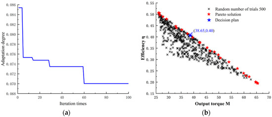 Data diagram of intelligent optimization algorithm for three-dimensional parameters of turbodrill: (a) Fitness curve diagram; (b) non-dominated optimal solution and TOSIS decision diagram.