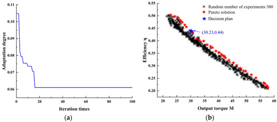 It can be observed from Figure 9a that as the number of iterations increases, the slope of the fitness curve decreases significantly. This phenomenon shows that the algorithm performs well in finding feasible solutions, and the model prediction accuracy and performance continue to improve. It can be seen from Figure 9b that the MOPSO algorithm successfully identifies a series of non-dominated optimal solutions and forms the corresponding Pareto solution set. The distribution of 500 sets of random test results further verifies the rationality of the Pareto solution, which achieves a good balance between the output torque and hydraulic efficiency of the turbodrill. Then, the optimal solution is determined by the entropy weight Topsis method: M = 30.23 N·m, η = 44%; at the same time, the key parameters of the optimized turbine space modeling are: , , .