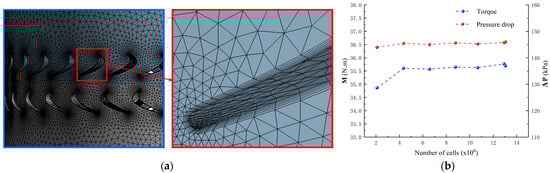 In the meshing module of ANSYS software, in order to ensure that the geometric characteristics of complex flow channels are fully analyzed, this study uses tetrahedral unstructured grids to discretize the flow field region. The boundary layer refinement zone is set on the blade surface. The thickness of the first layer grid is 4 × 10−5 m, and the interlayer growth rate is set to 1.2. A total of five layers of boundary layer grids are generated to accurately capture the near-wall flow characteristics and shear stress distribution. In order to ensure the stability of the numerical calculation and the grid independence of the results, the total number of grids in the subsequent blade schemes is controlled to more than 4 million units, as shown in Figure 11a,b below.