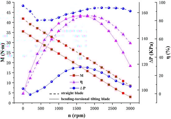 To further validate the low-speed, high-torque performance of the designed Φ178 mm bend–twist–tilt blade, we conducted comparative simulations against existing blade geometries under identical boundary conditions. For these tests the working fluid was specified with a density of ρ = 1200 kg/m3 and a dynamic viscosity of 0.0072 Pa·s, the k–ε turbulence model was employed, and all other simulation settings were held constant. From the flow field contours of Figure 13c and Figure 14c, it can be seen that with the increase in drilling fluid density and viscosity, the pressure drop of the system increases slightly, but the fluid flow still maintains high stability. Under the working condition of 400 rpm, the output torque of the bent-twisted blade reaches 37.43 N·m, and the hydraulic efficiency is 39.8%. In contrast, the single-stage turbine torque of the existing space-designed blade is 27.4 N·m and the hydraulic efficiency is 44.7% [19], as shown in Figure 15. The results show that the torque output of the designed blade is 36.6% higher than that of the traditional blade. Despite a modest 4.9% reduction in hydraulic efficiency, the substantially improved low-speed, high-torque performance validates the effectiveness and engineering viability of the proposed 2D blade profile and the bending–twist–tilt 3D shaping strategy. These outcomes demonstrate the blade’s strong potential for application in deep-well drilling and other high-load operational scenarios.