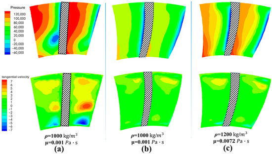 The pressure and velocity cross-section cloud diagram at the maximum curvature of the blade profile: (a) The straight blade simulation cloud diagram corresponding to the optimized two-dimensional blade parameters; (b) The simulation cloud diagram of the curved blade corresponding to the optimized three-dimensional space modeling parameters; (c) The simulation cloud diagram of the curved-twisted-tilted blade under different density and viscosity.