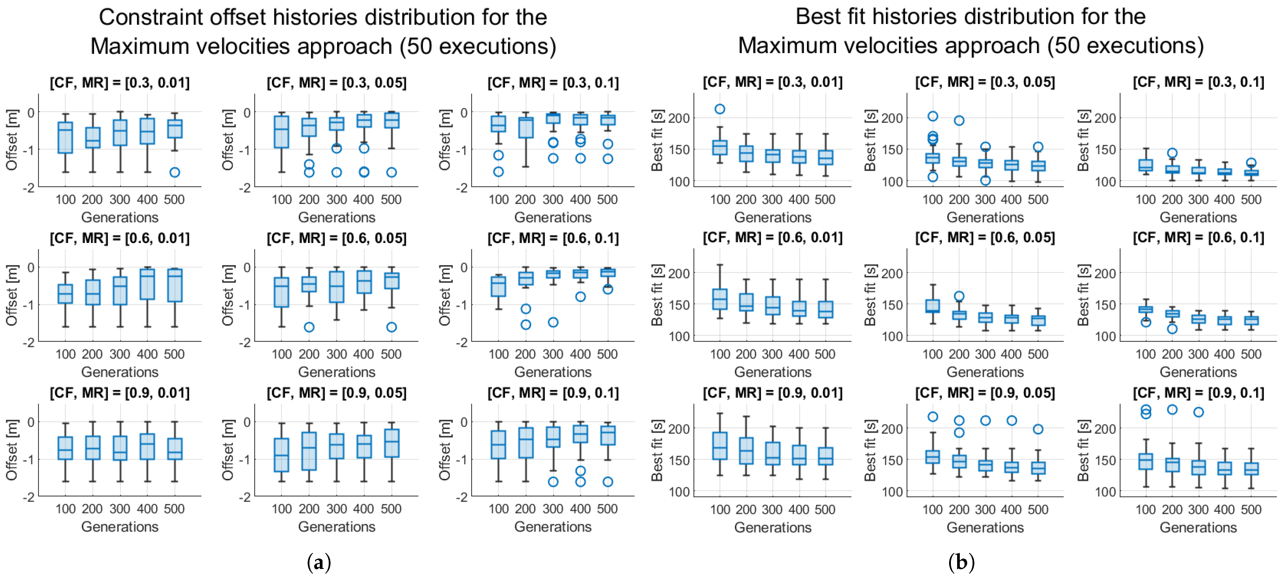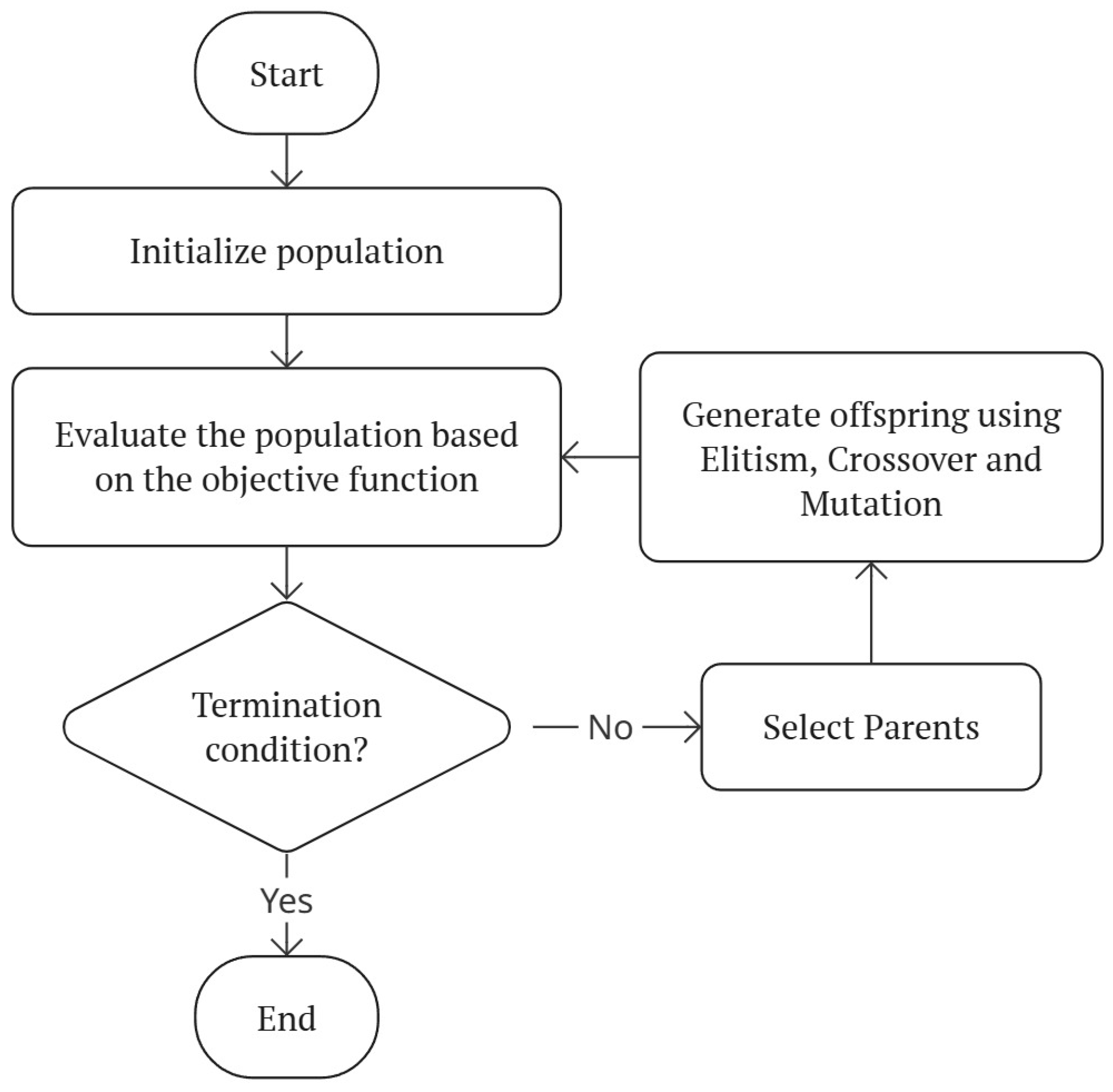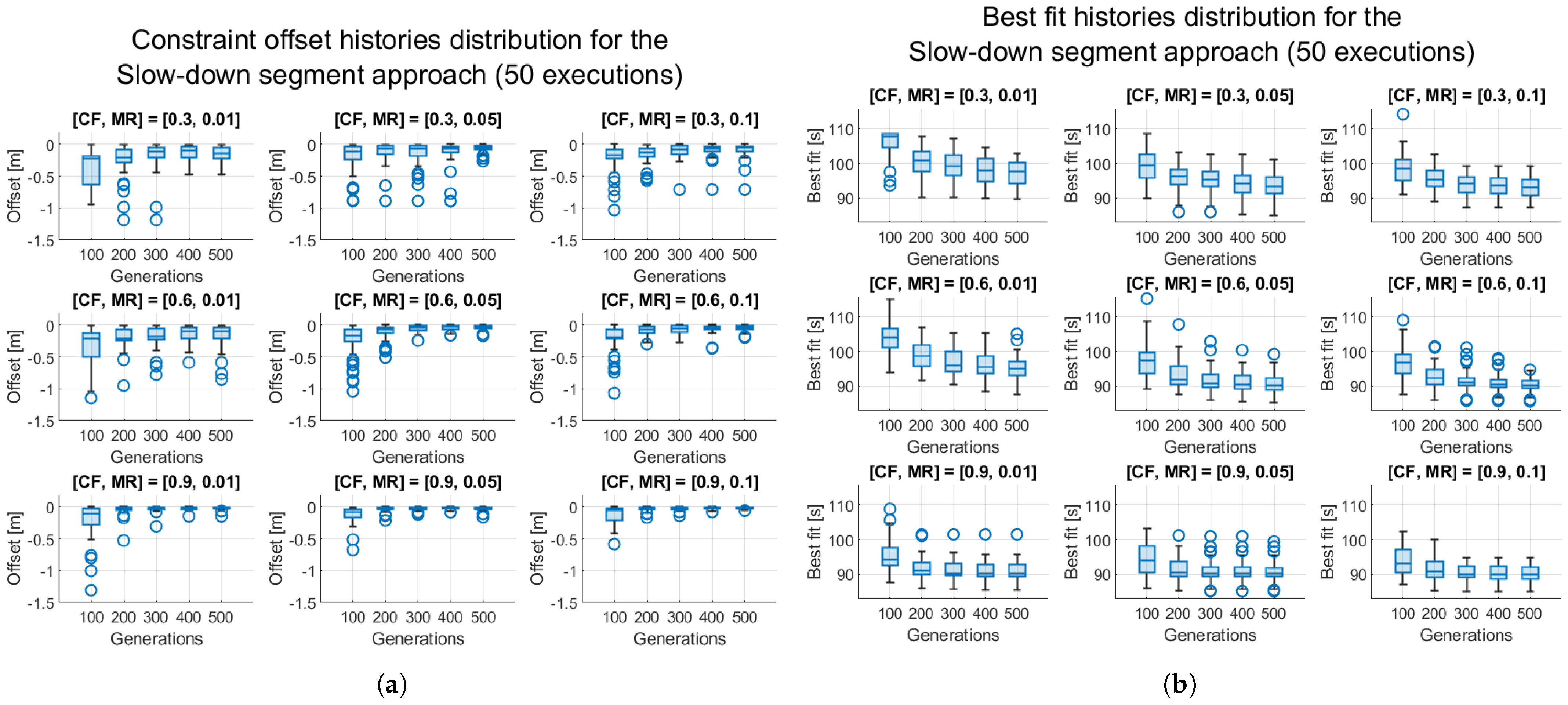 Figure 1, begins with an initial population of velocity profiles, where each individual represents a candidate solution. At each iteration, individuals are evaluated based on an objective function that considers travel time, energy consumption, and collision constraints. After the evaluation phase, the best-performing individuals are selected to generate the next population. Parent selection is performed using a stochastic uniform selection method, which ensures that individuals with higher fitness have a greater chance of being selected, while maintaining diversity across the population. Other selection strategies can also be employed, each providing a different balance between selection pressure and population diversity. After the selection phase, the next generation of individuals is produced through a combination of elitism, crossover, and mutation operations. Elitism is first applied to ensure that the best-performing individuals of each generation are directly copied to the next one without modification. This mechanism prevents the loss of high-quality solutions during the evolutionary process and accelerates convergence by preserving the most promising candidates. After elitism, the remaining individuals in the new population are generated through crossover and mutation. Crossover operators combine parent solutions to produce offspring by exchanging their genetic material. The Crossover Fraction (CF) determines the portion of the population that undergoes crossover at each generation, controlling how much information is shared between parent solutions. A higher CF emphasizes exploitation, focusing the search around high-fitness regions, whereas a lower CF maintains diversity by allowing more direct inheritance from parent individuals. Mutation, applied to each gene with a probability defined by the Mutation Rate (MR), introduces small random variations to promote exploration and avoid premature convergence. Together, crossover and mutation balance the dual objectives of exploration and exploitation in the search space [