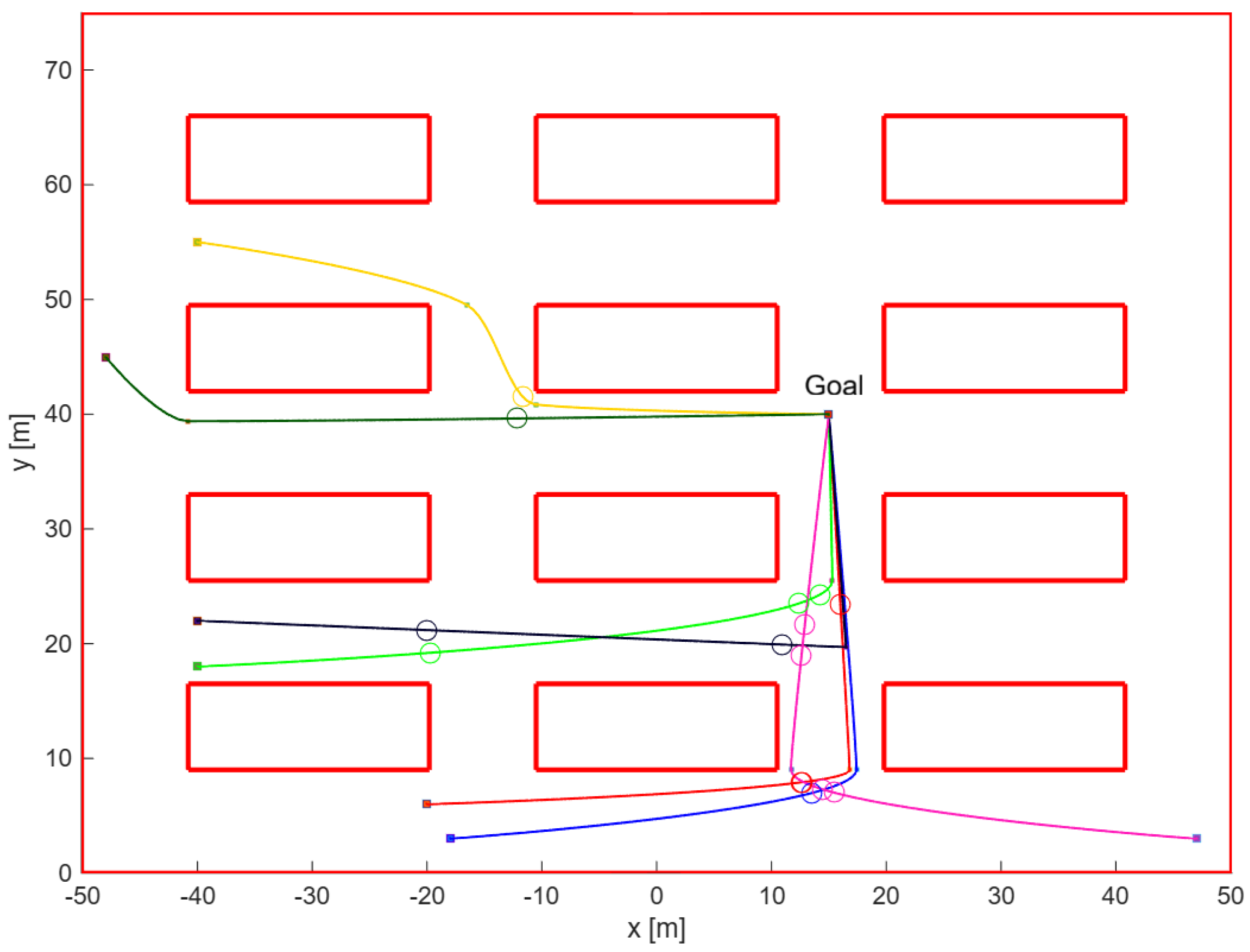 . These collision constraints take into account the trajectories of all robots and ensure that the solution complies with the physical limitations of each robot defined in Equation (