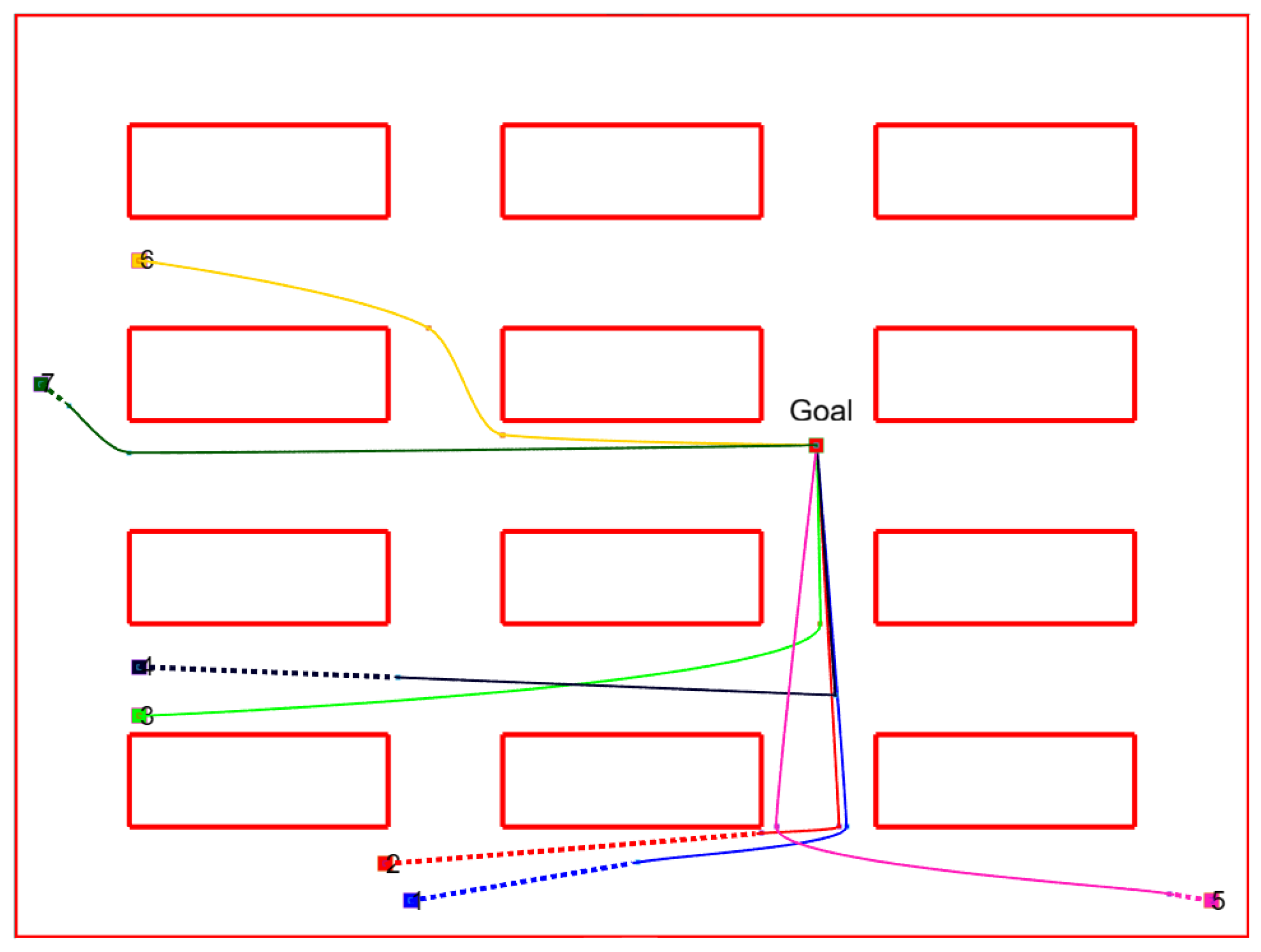 In the starting scenario, where no collision avoidance strategy is applied, the 7 robots move freely at their maximum allowed velocities, resulting in a finish time of 76 s and a total energy consumption of 3.00 kJ. These values represent the best theoretical performance in terms of travel time but also the worst-case scenario for safety management, since there is still no collision avoidance algorithm involved.