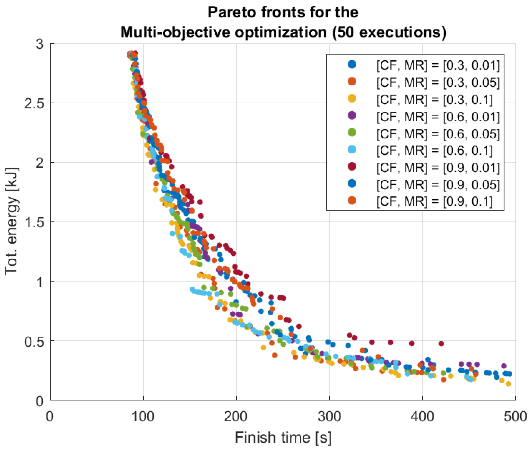 24]. Each point on the Pareto front represents a different trade-off: some solutions can be chosen to prioritize faster task completion at the cost of higher energy consumption, while others prefer lower energy usage at the expense of longer travel times. The optimization problem is formulated as follows: