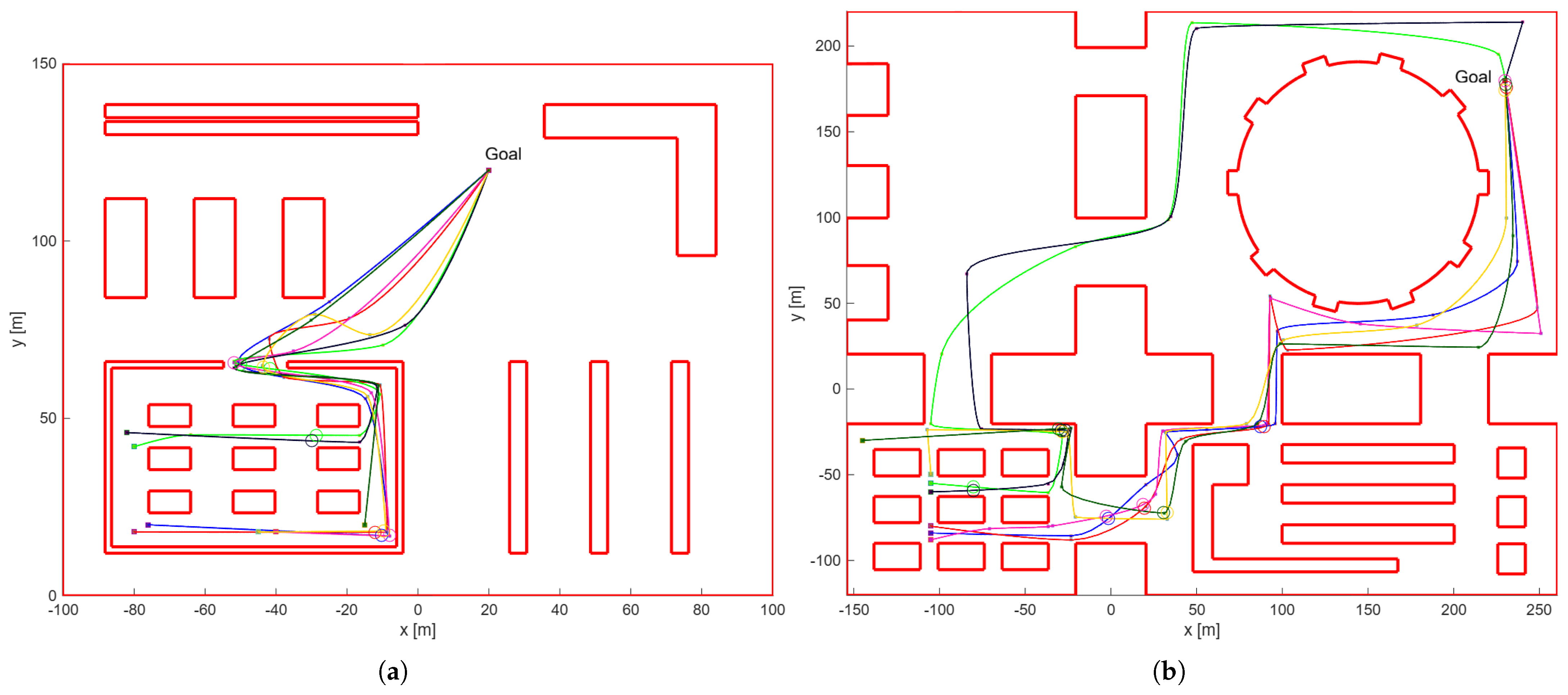 To further validate the scalability and robustness of the proposed framework, two additional simulation scenarios were analyzed. These scenarios were characterized by larger and more complex environments, with irregular obstacles and narrower passages. In the initial conditions, 5 and 10 collisions were detected, with total finish times of 234 s and 686 s for the second and third scenarios, respectively. The experiments focused on the SDS-SOO approach, using the parameter combination
