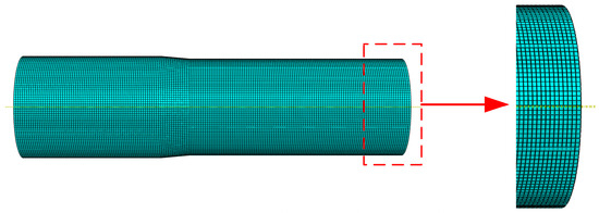A three-dimensional dynamic explicit finite element model was established in the FEM environment to simulate the spinning process, as shown in Figure 3. The billet material was assumed to be homogeneous and isotropic. A total of 236,250 hexahedral elements (C3D8R) were employed, and the mesh distribution is illustrated in Figure 4. The plastic behavior of the material was modeled using the von Mises yield criterion combined with isotropic strain hardening [27]. In this study, the effects of strain-rate hardening and temperature dependence were neglected. Contact was defined using the penalty method, and Coulomb friction with a coefficient of 0.2 was adopted to simulate the interaction between the billet and the spinning roller. The roller trajectory is shown in Figure 5.