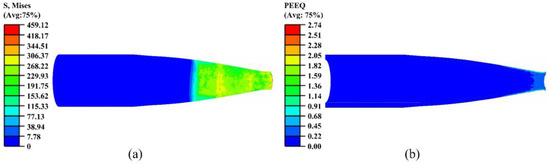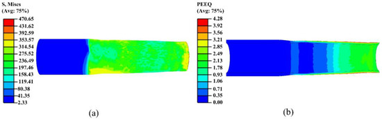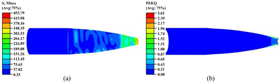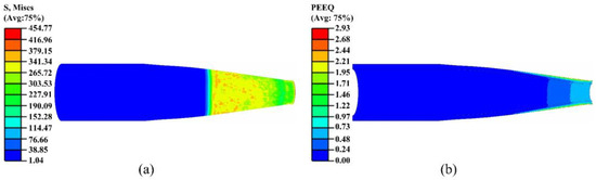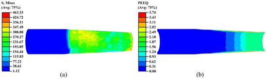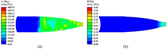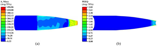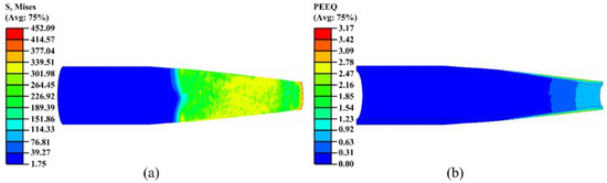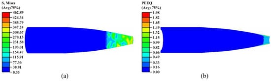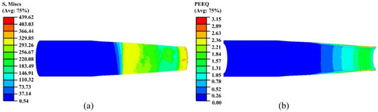 During the third spinning pass, the stress and strain within the workpiece continued to accumulate and gradually reached a stable state, as shown in Figure 9. The roller contact region and the end of the necking section remained the primary areas of stress concentration, where the material yielded and entered a steady deformation stage. The equivalent plastic strain further increased, extending both axially and radially with a more uniform distribution. This pass enhanced strain accumulation in the forming zone and achieved better coordination between stress and strain.