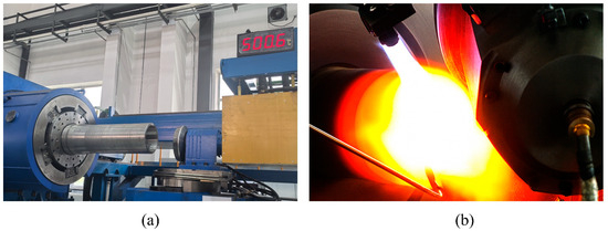 Figure 17a shows the initial state of the workpiece and equipment before spinning. As the roller progressively applied localized deformation in successive passes, the metal underwent significant plastic flow under localized loading, enabling gradual diameter reduction and a rational redistribution of wall thickness along the convergent section. Figure 17b illustrates the hot spinning process of the nozzle. The workpiece was heated by the flame to a high-temperature range of 900–1000 °C, achieving an ideal plastic state. Under the localized loading of the roller, the material experienced plastic flow and progressively formed the convergent section. This process clearly demonstrates the forming mechanism of hot spinning, characterized by localized loading and progressive shaping, in which multiple small deformations under elevated temperatures are accumulated to achieve precise control of both the overall geometry and wall thickness distribution.