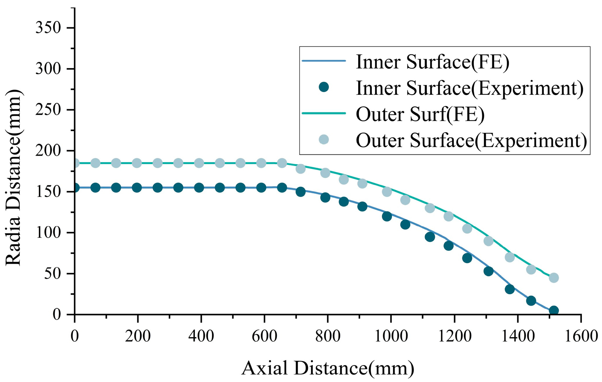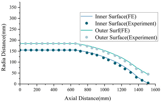 Figure 19 presents the overlapped contour comparison between the experimental specimen and the finite element simulation prediction. As can be observed, across the entire axial range, both the outer and inner surface profiles show good agreement between the simulation and the experimental measurements. In particular, within the necking section, the predicted contour curves closely match the experimental results in terms of shape variation, curvature distribution, and transition trend during contraction. This demonstrates the high accuracy and feasibility of the employed forming path planning strategy and mandrel-free deformation control method, providing a reliable foundation for subsequent process optimization.