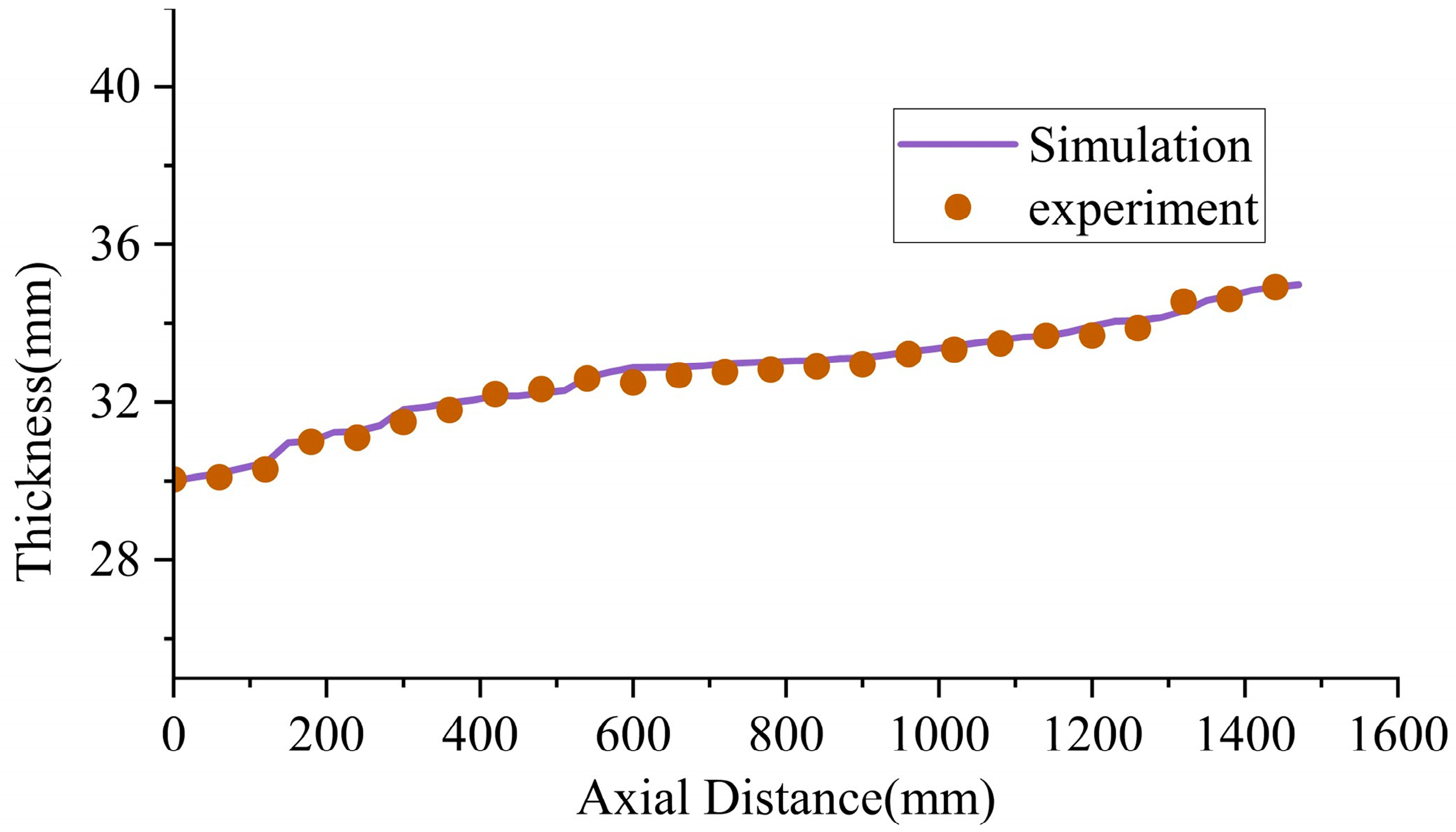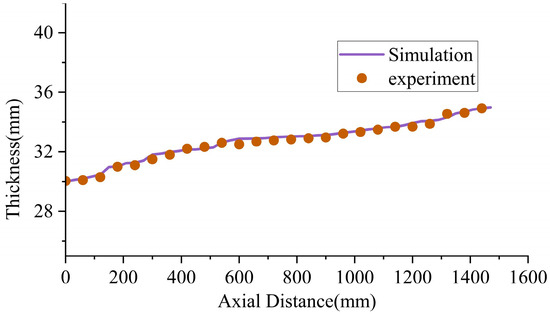 Figure 20 illustrates the comparison of wall thickness evolution along the axial direction between the experimental measurements and finite element simulation results. As shown, the overall trend of the wall thickness distribution exhibits a high degree of consistency, indicating that the simulation model possesses strong predictive capability in capturing material migration behavior in both axial and radial directions. Furthermore, the simulation data closely track the experimental wall thickness variation across the entire axial span, with deviations well controlled within a small range. This further confirms the reliability and practical applicability of the developed thermal spinning finite element model in predicting deformation depth and wall thickness evolution.