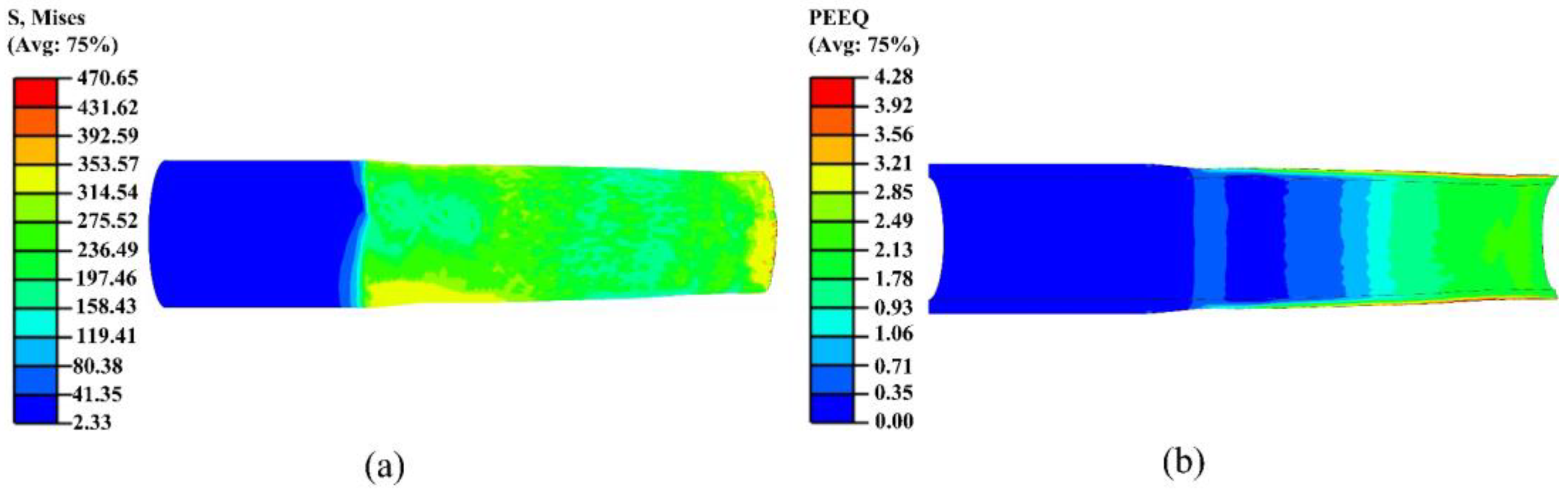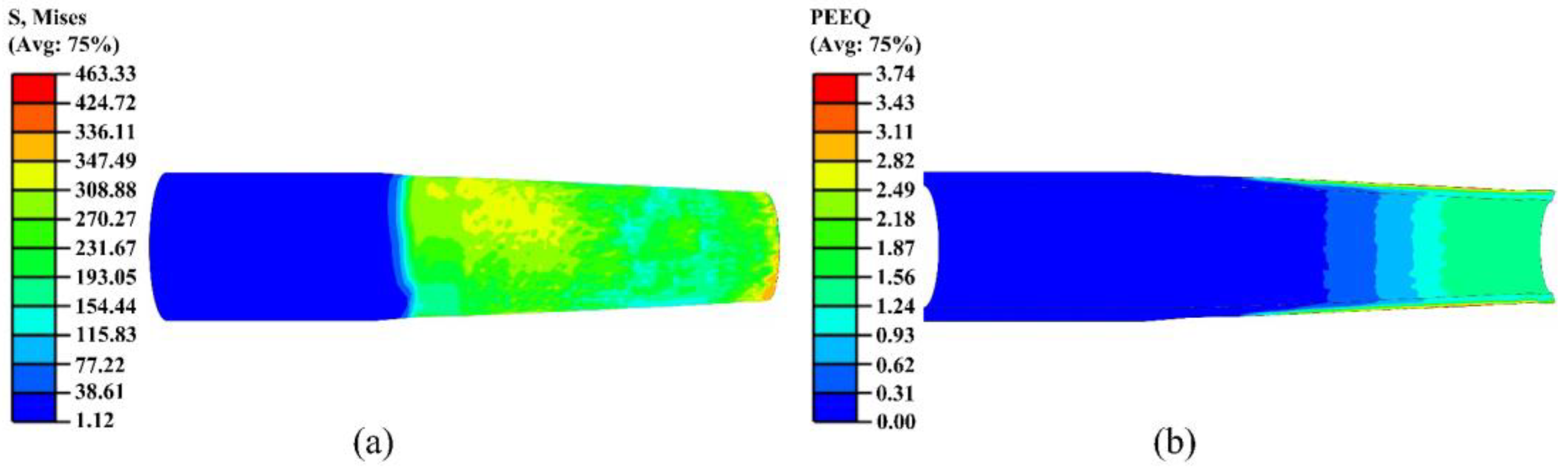 Figure 15. The equivalent stress was concentrated in the outer layer of the small-end region. The deformation zone was confined to the edge of the small end, with limited axial and radial expansion, ensuring the final geometry of the nozzle and effective control of residual stresses.