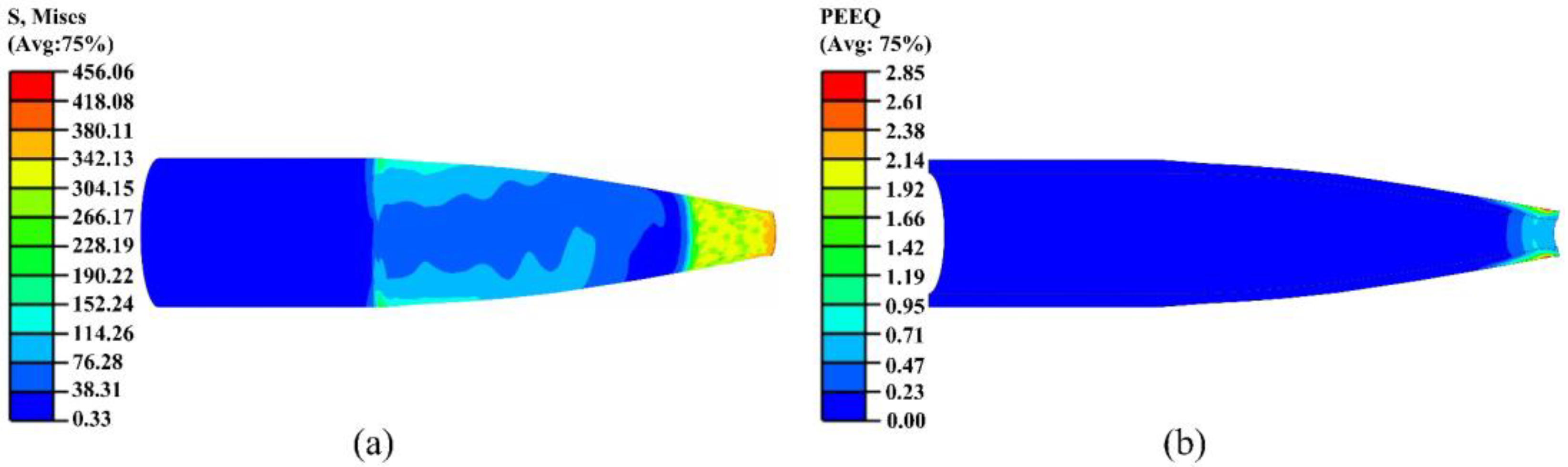 Figure 13. The equivalent stress was concentrated in the outer layer of the small-end region, while it significantly decreased in other areas. The strain was confined to the outer layer near the small-end tip, exhibiting a gentle gradient that ensured the final geometric accuracy and structural stability.