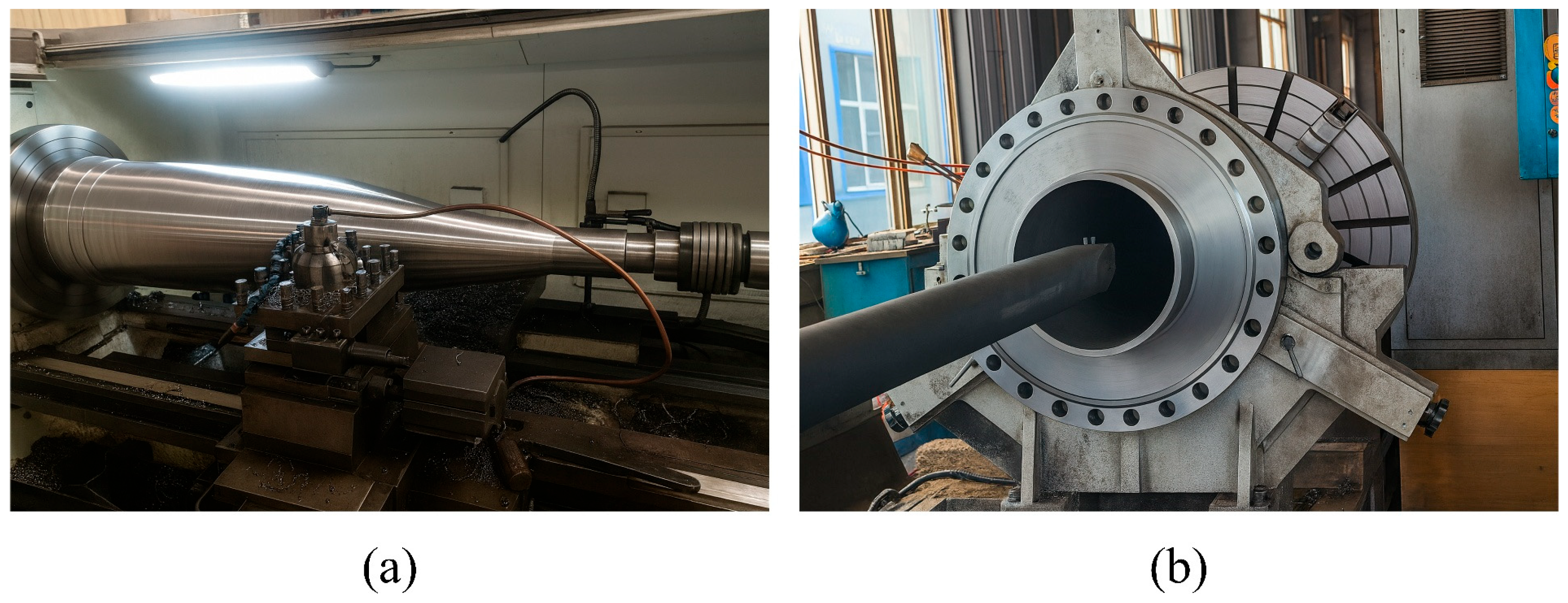 Figure 17a shows the initial state of the workpiece and equipment before spinning. As the roller progressively applied localized deformation in successive passes, the metal underwent significant plastic flow under localized loading, enabling gradual diameter reduction and a rational redistribution of wall thickness along the convergent section.